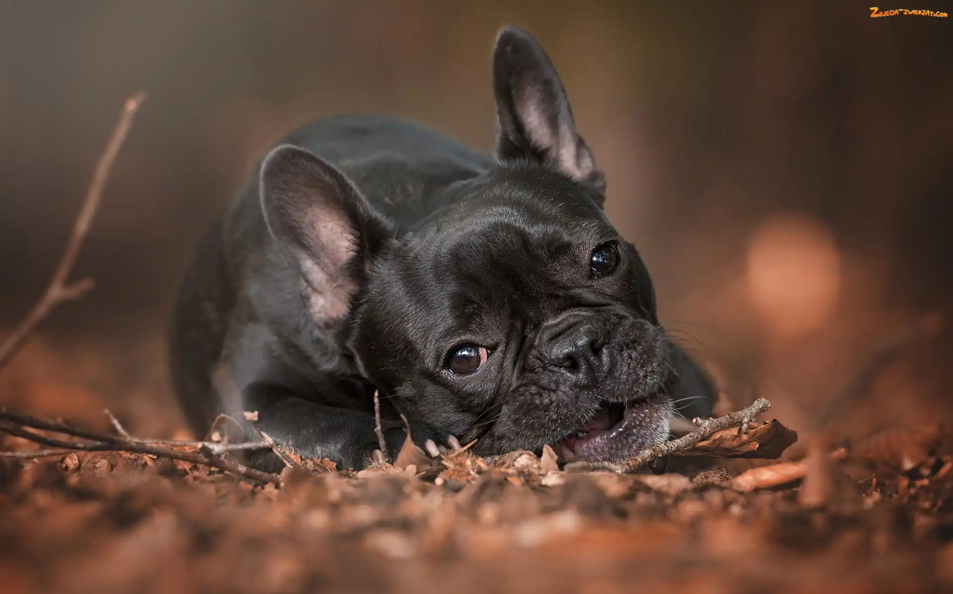 Zdjęcie: Gałązki, Buldog francuski, Liście