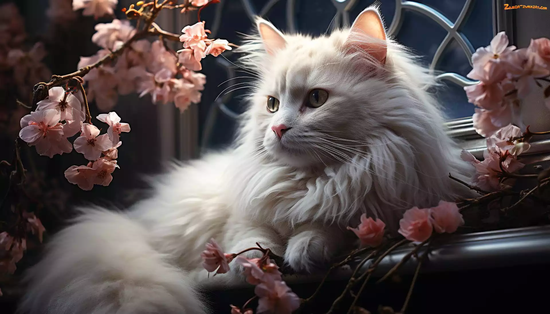 Zdjęcie: Kwiaty, Gałązki, Grafika, Kot, Biały