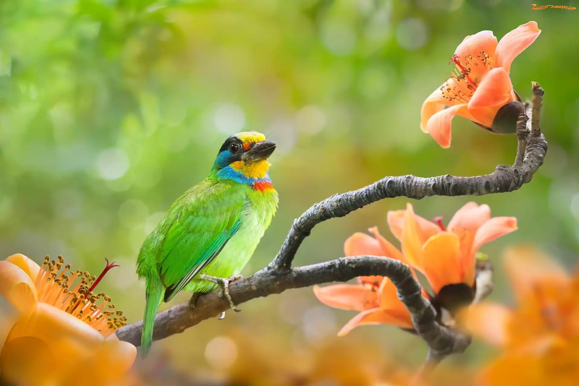 Zdjęcie: Gałązki, Ptak, Kolorowy, Pomarańczowe, Kwiaty, Zielony, Pstrogłów tajwański