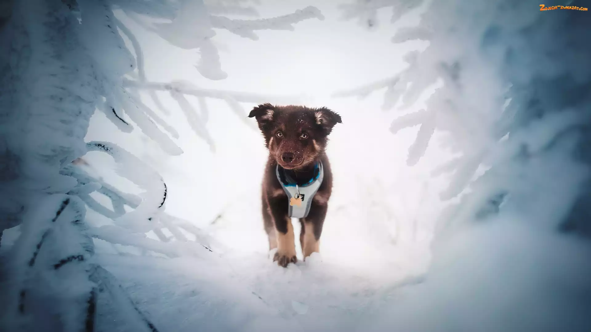 Zdjęcie: Gałązki, Ośnieżone, Szczeniak, Pies, Szelki