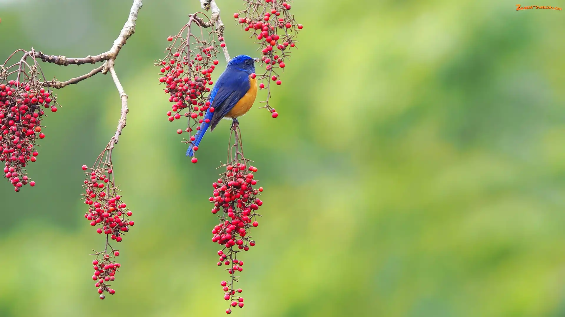 Zdjęcie: Owoce, Gałązki, Niltawa ognista, Ptak, Czerwone, Niebiesko-żółty