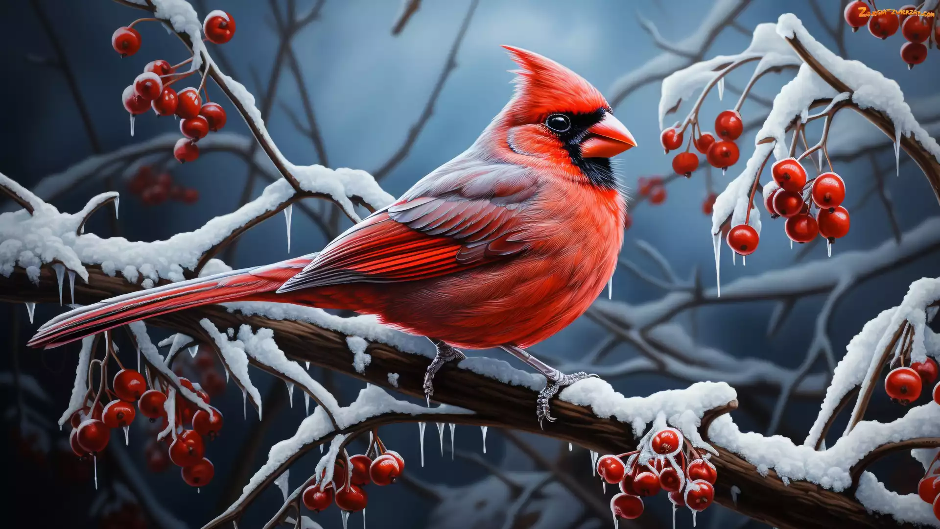 Zdjęcie: Czerwone, Ptak, Kardynał, Gałęzie, 2D, Ośnieżone, Owoce