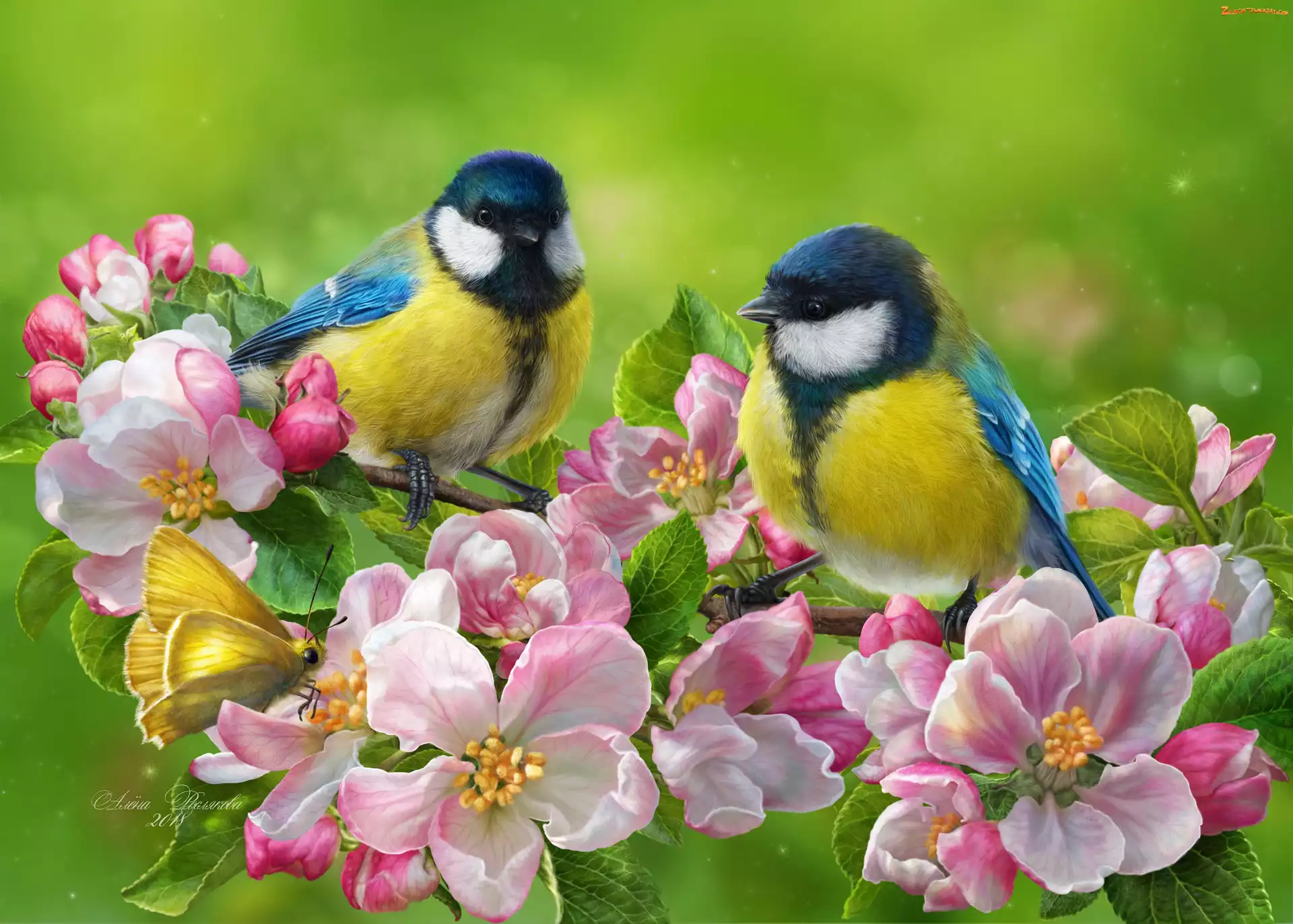 Zdjęcie: Motyl, Gałęzie, Ptaki, Drzewa, Kwiaty, Sikorki modre, Kwitnące