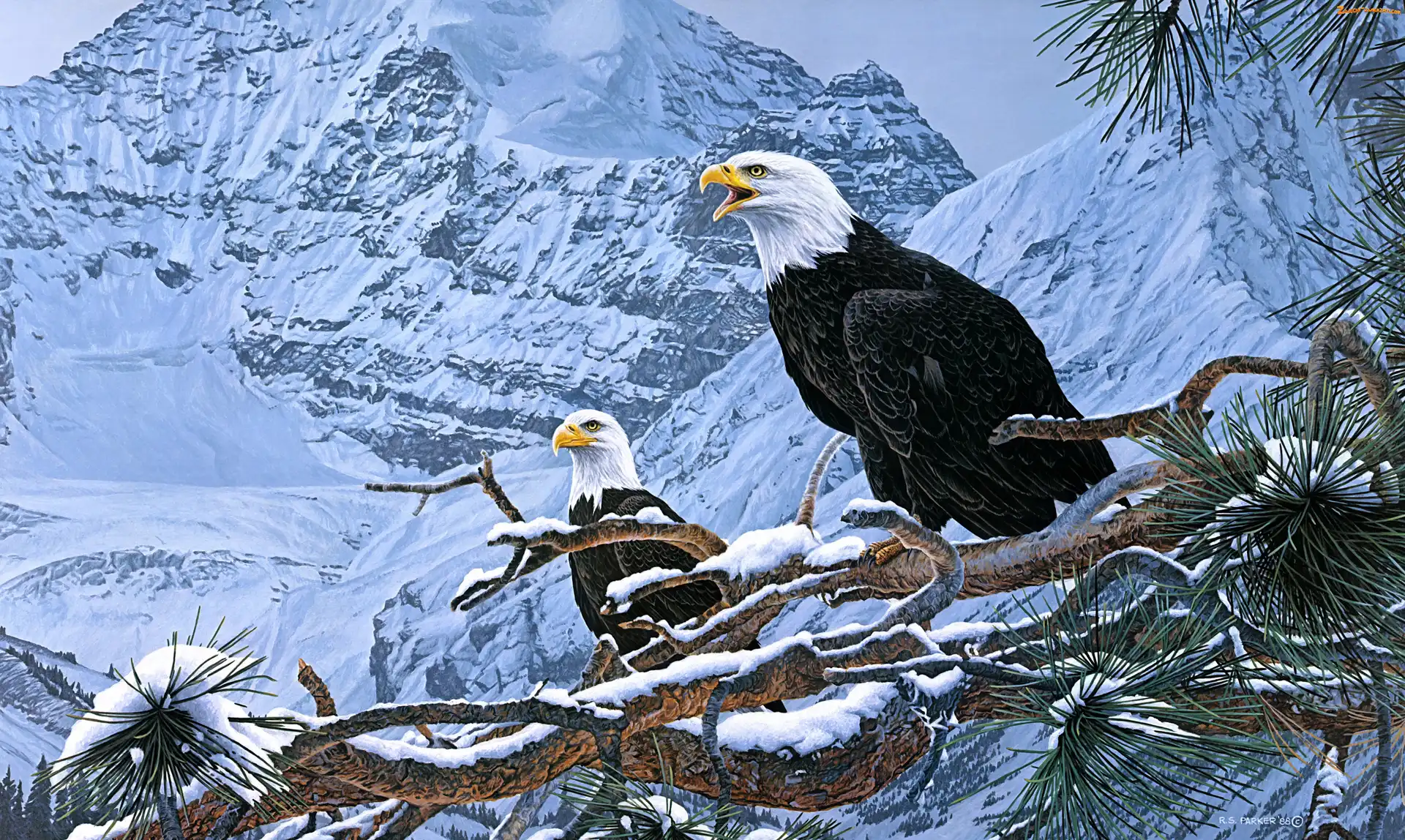 Zdjęcie: Bieliki amerykańskie, Gałęzie, Góry, Malarstwo, Drzewo, Śnieg, Ron Parker, Obraz, Zima