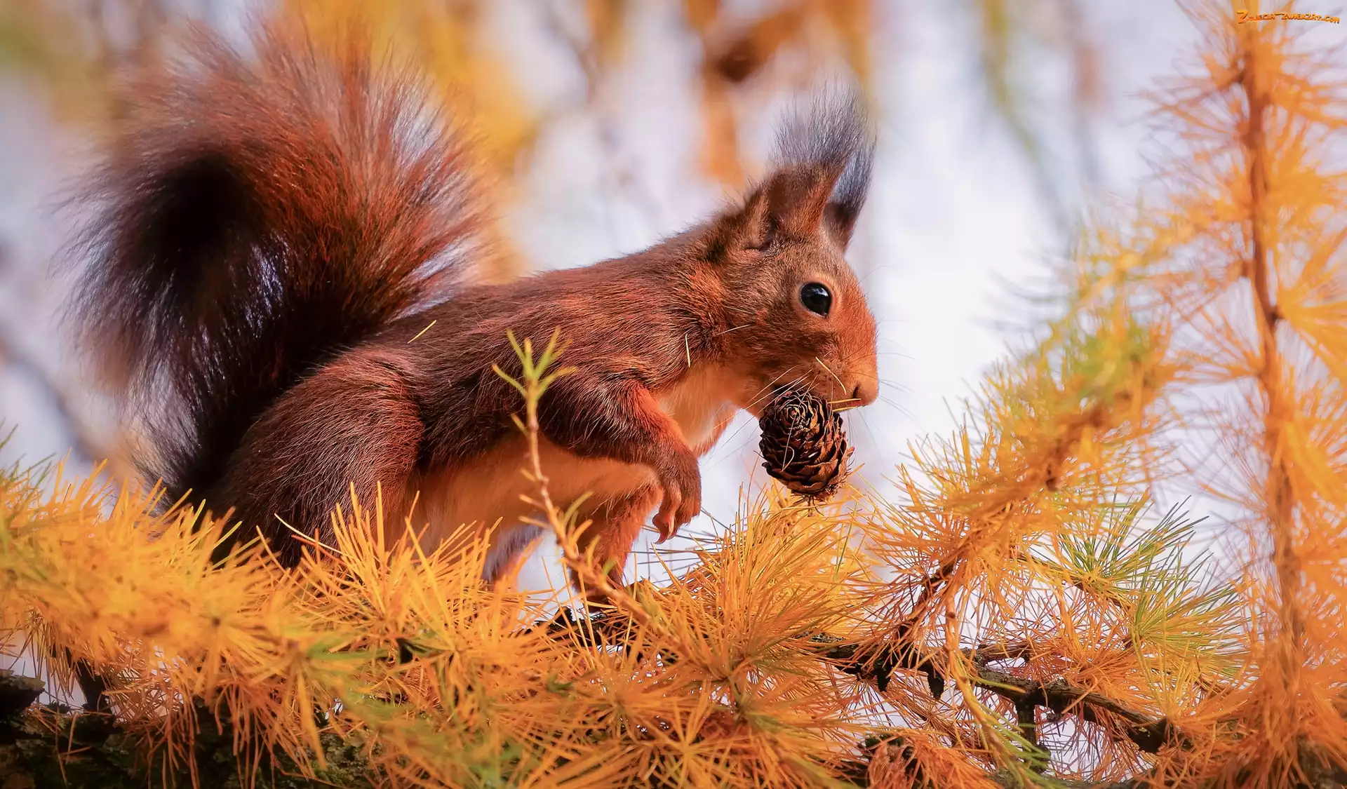 Gałęzie, Modrzew, Szyszka, Wiewiórka, Drzewo
