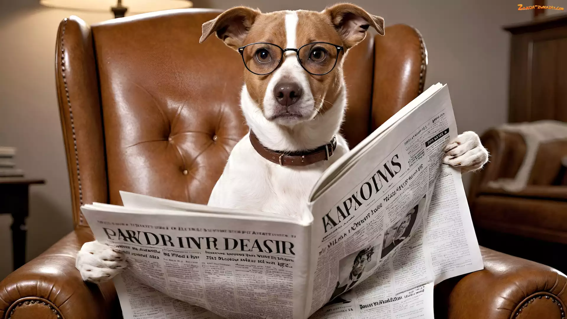 Zdjęcie: Fotel, Jack Russell terrier, Grafika, Pies, Okulary, Gazeta