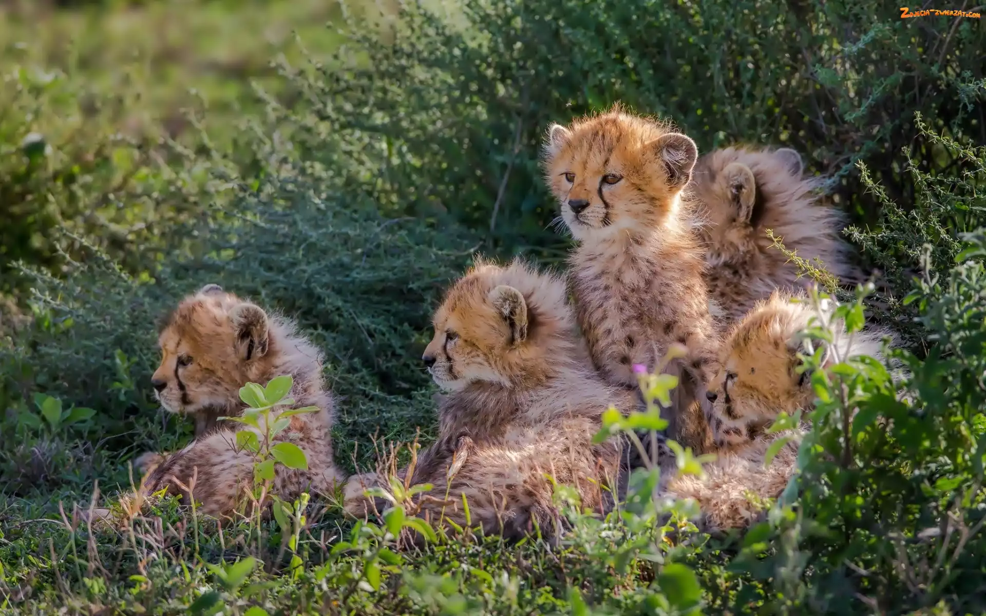 Zdjęcie: Gepardy, Trawa, Młode, Krzewy