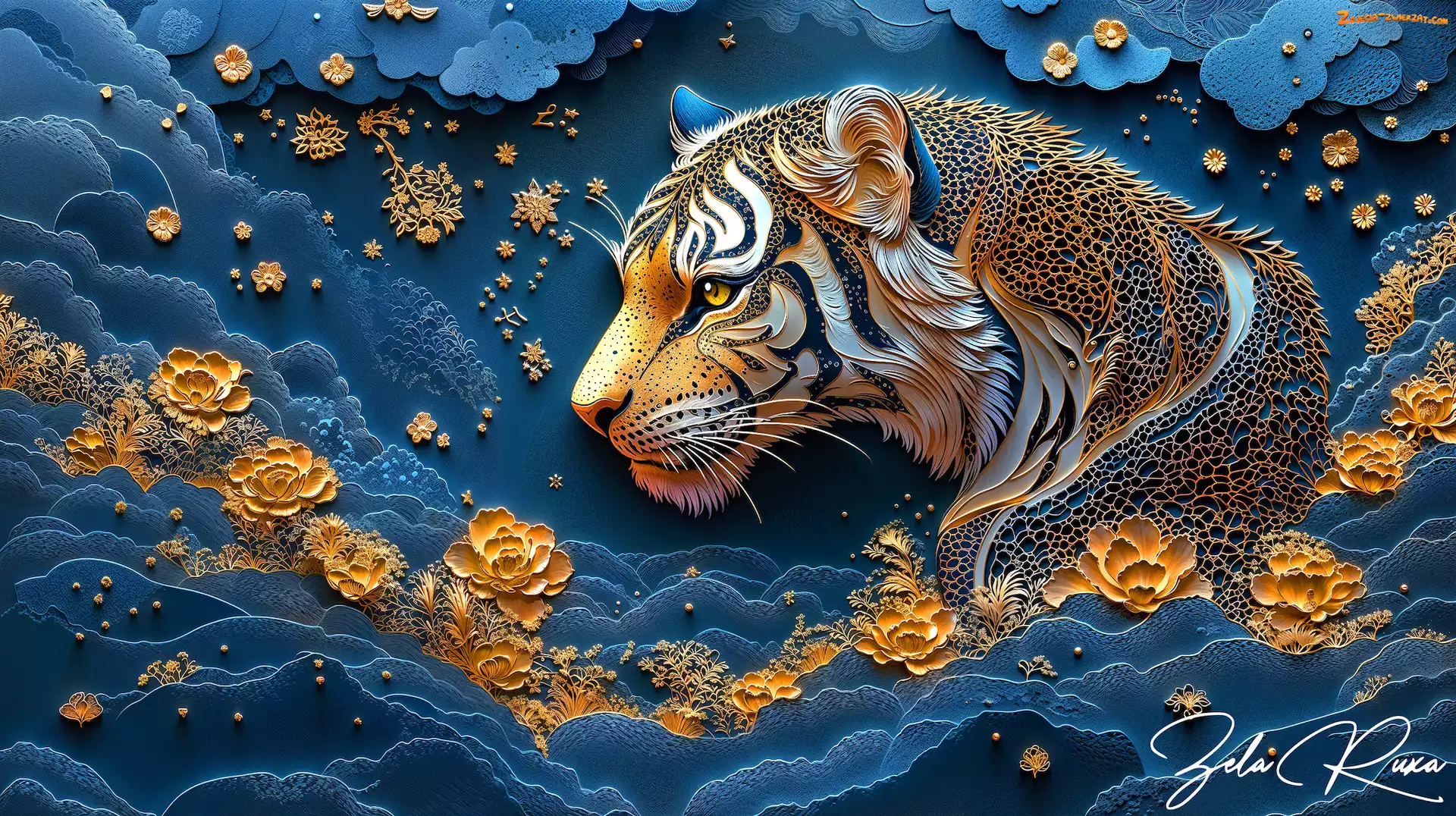 Zdjęcie: Grafika, Tygrys, Kwiaty, Głowa