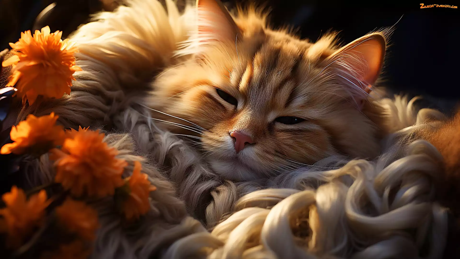 Koc, Głowa, Kwiaty, Zasypiający, Kot