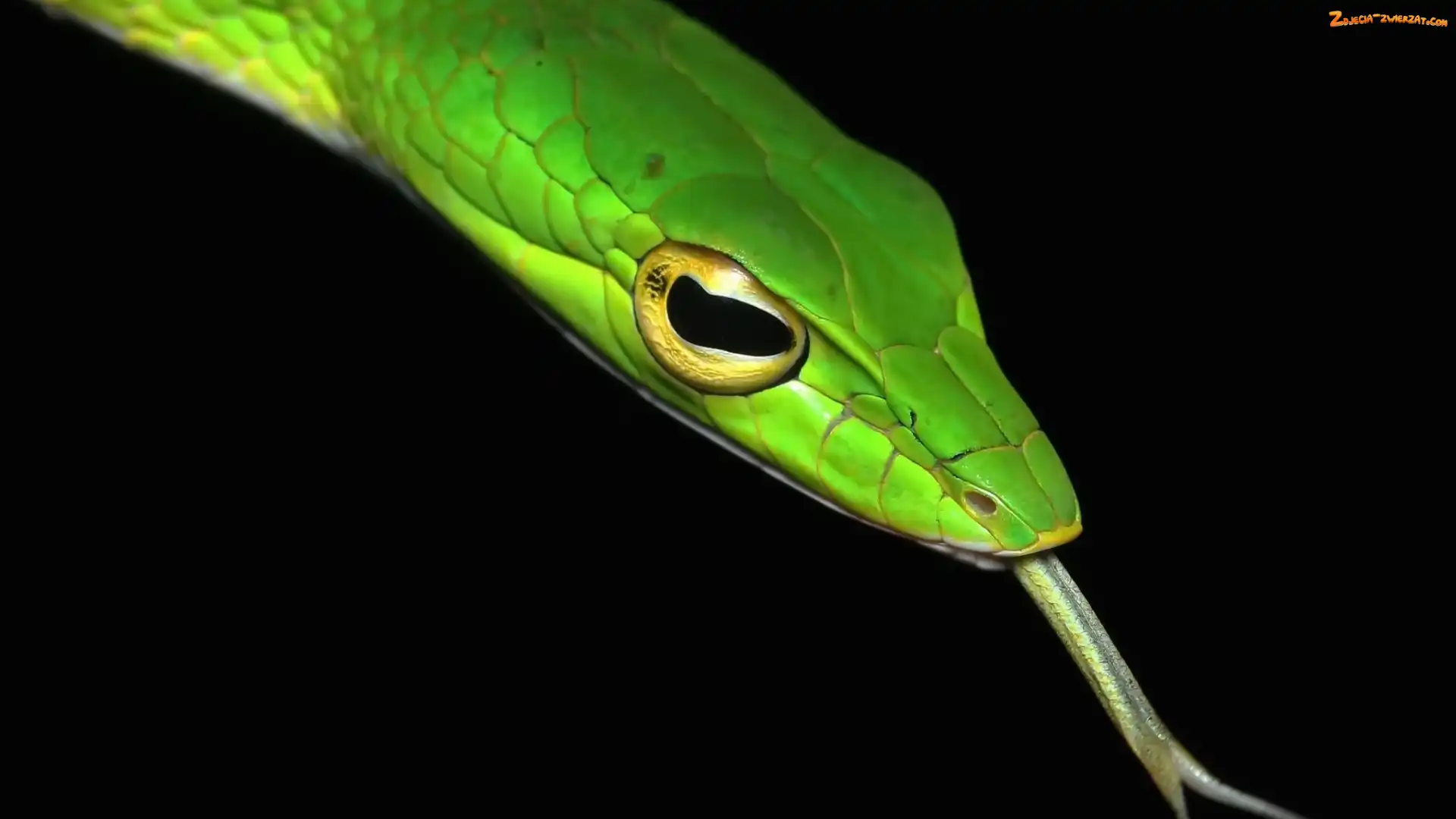 Zdjęcie: Zielony, Głowa, Ciemne tło, Język, Wąż, Ahaetulla mycterizans