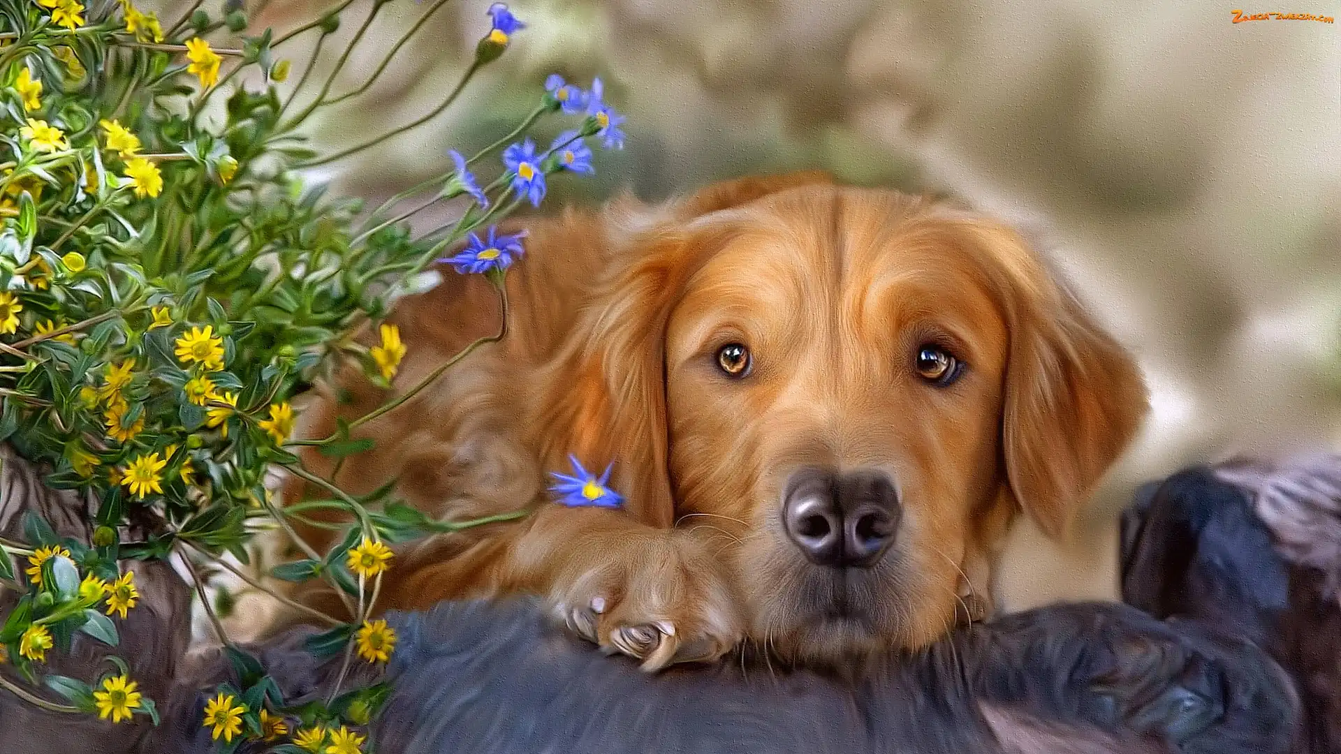 Zdjęcie: Golden retriever, Grafika, Pies, Kwiaty