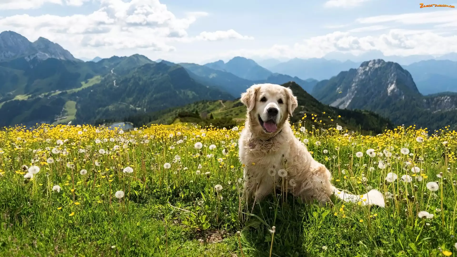 Zdjęcie: Góry, Łąka, Pies, Golden retriever, Kwiaty, Dmuchawce