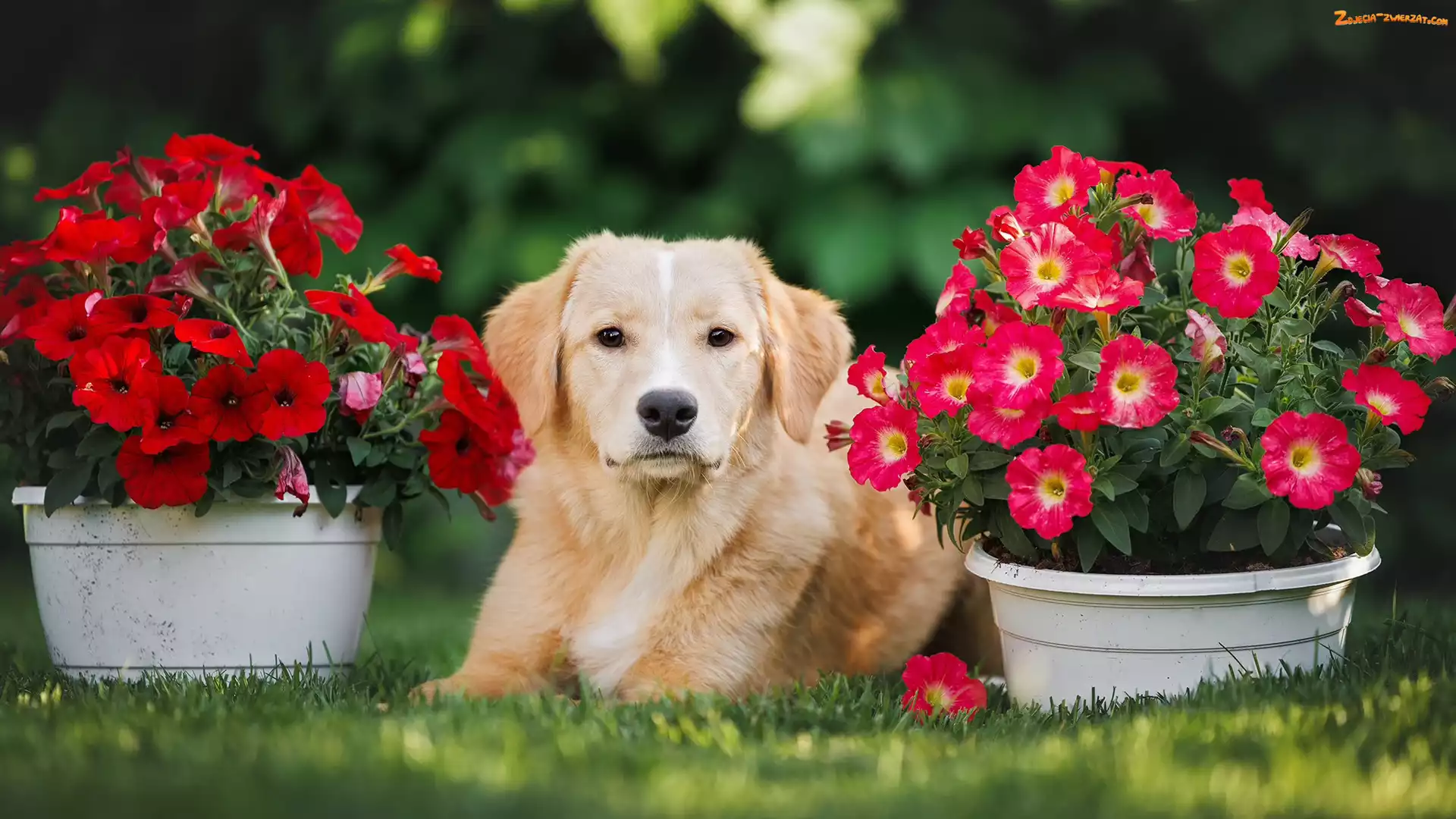 Zdjęcie: Pies, Golden retriever, Petunie, Kwiaty