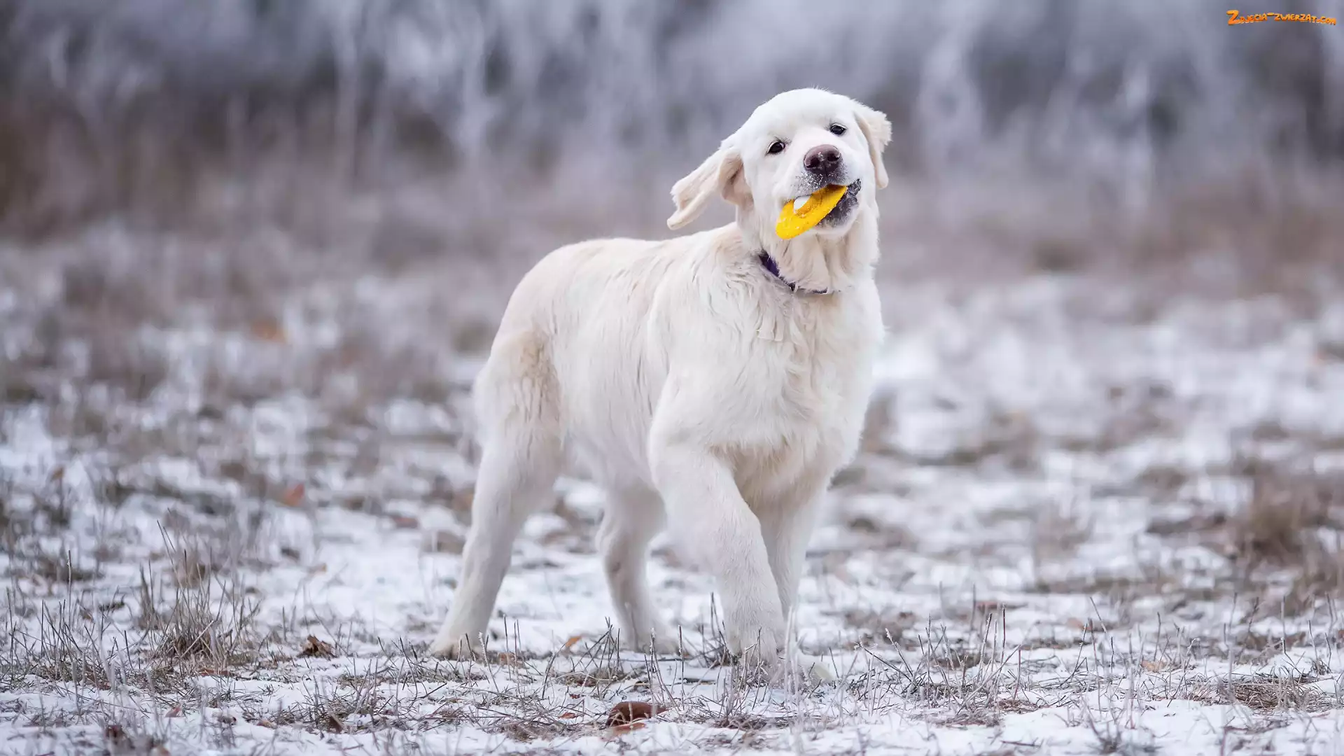 Zdjęcie: Golden retriever, Śnieg, Szczeniak, Zabawka