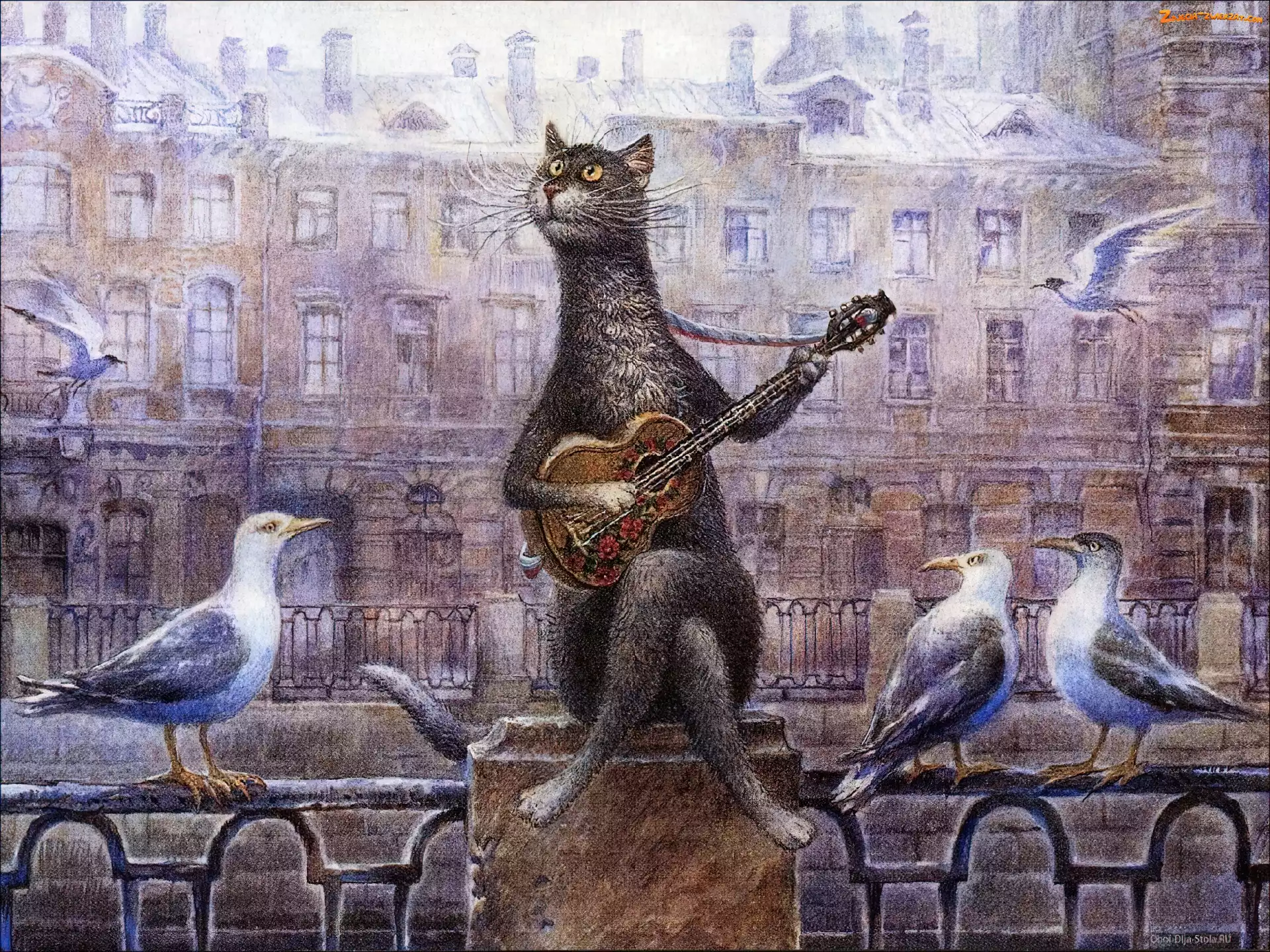 Zdjęcie: Gołębie, Gitara, Obraz, Włodzimierz Rumiancev, Kot