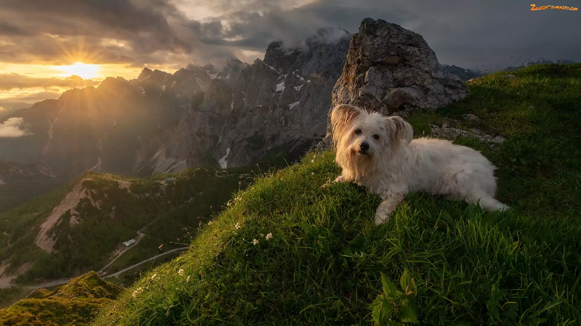 Zdjęcie: Słowenia, Pies, Szczyt, Alpy Julijskie, Wschód słońca, Trawa, Góry