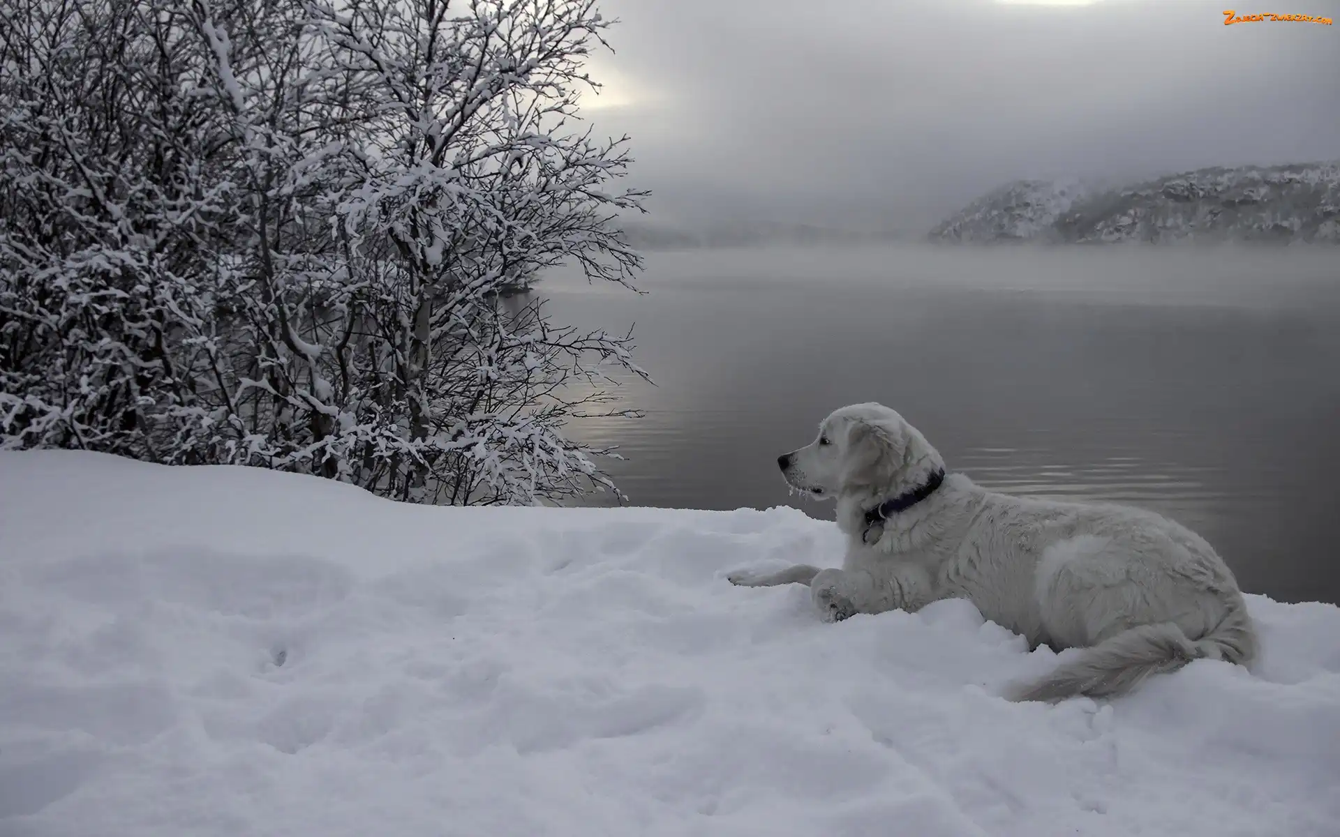 Zdjęcie: Zima, Góry, Pies, Drzewo, Zmrok, Rzeka, Mgła