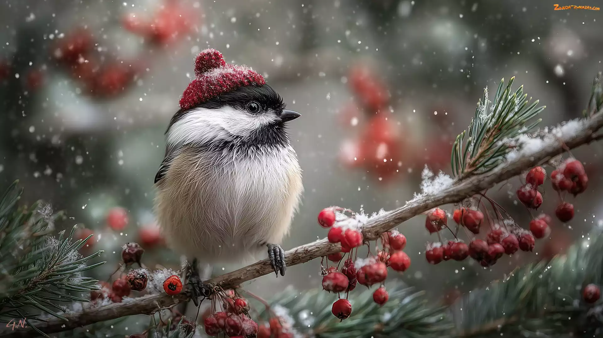 Zdjęcie: Grafika AI, Czapka, Sikorka czarnogłówka, Czerwona, Gałązka, Czerwone owoce