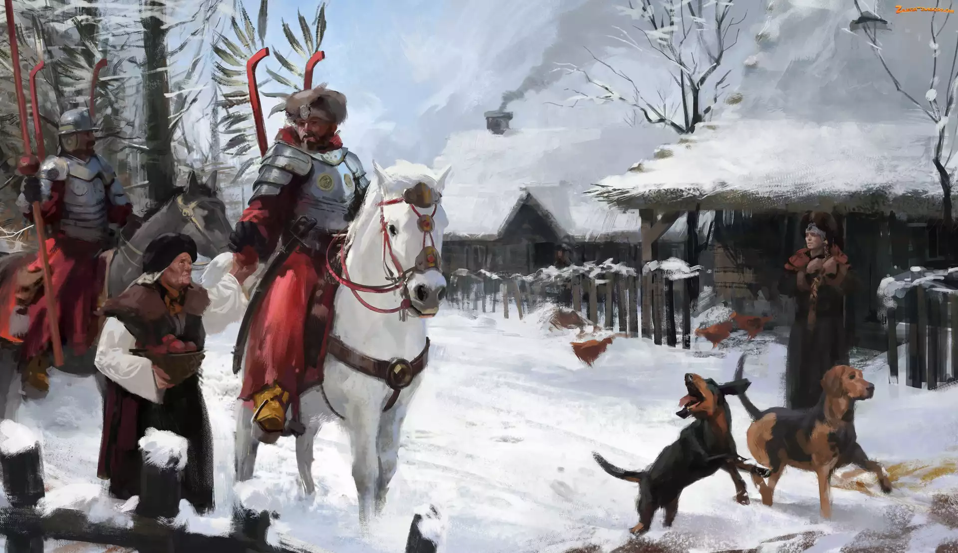 Zdjęcie: Konie, Wieś, Mężczyzna, Kury, Husaria, Kobieta, Grafika, Jeźdźcy, Zima, Chaty, Psy