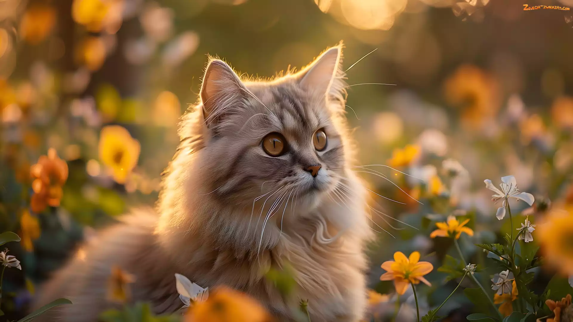 Zdjęcie: Zachód słońca, Łąka, Grafika, Kot, Kwiaty