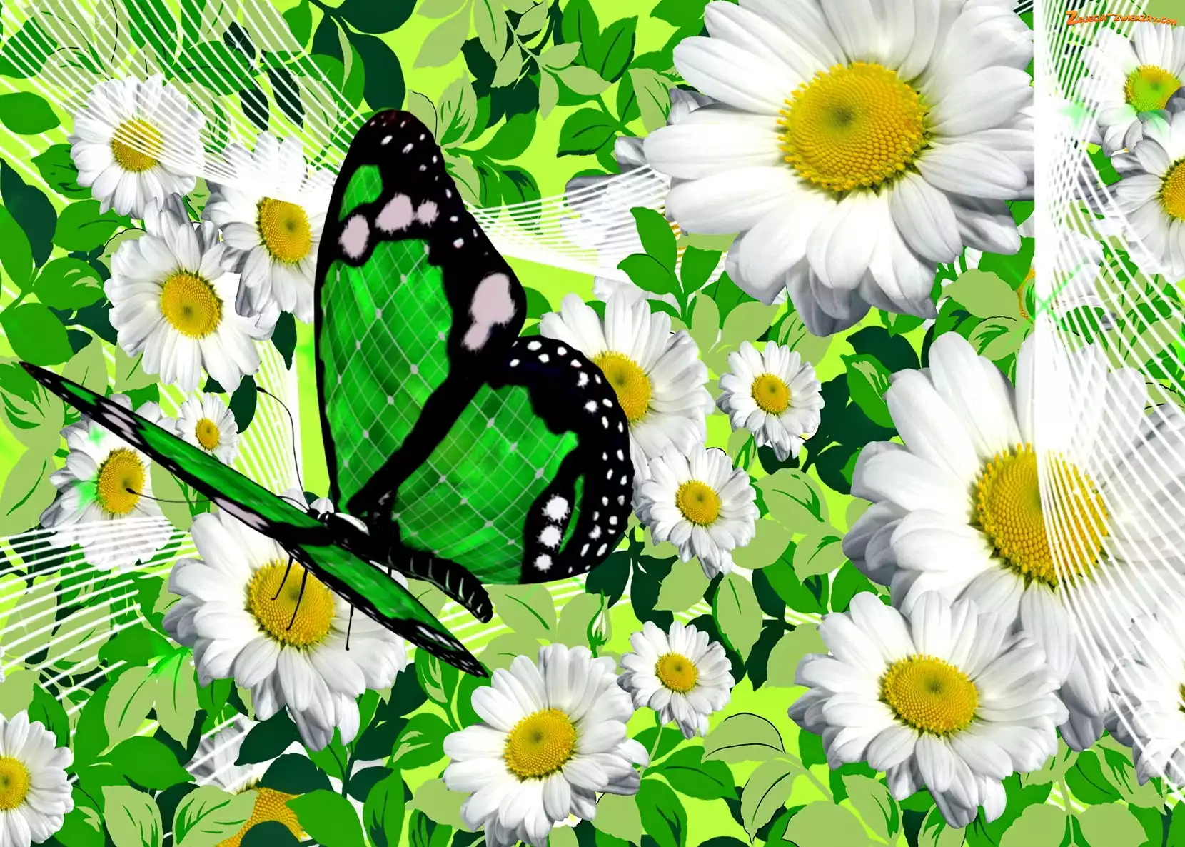Zdjęcie: Grafika, Motyl, Rumianek, Kwiaty, Zielony
