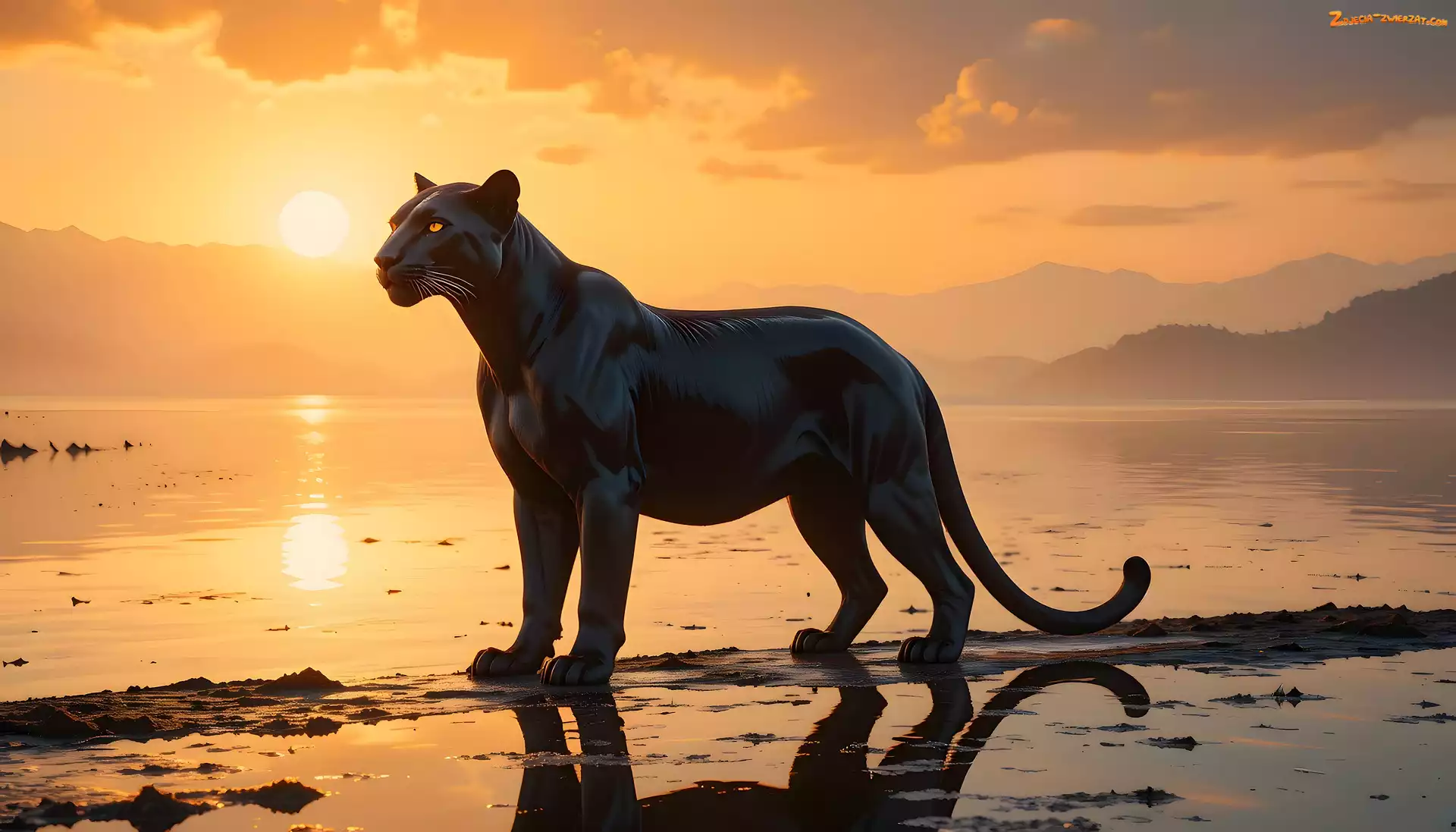 Zachód słońca, Jezioro, Grafika, Czarny, Lampart