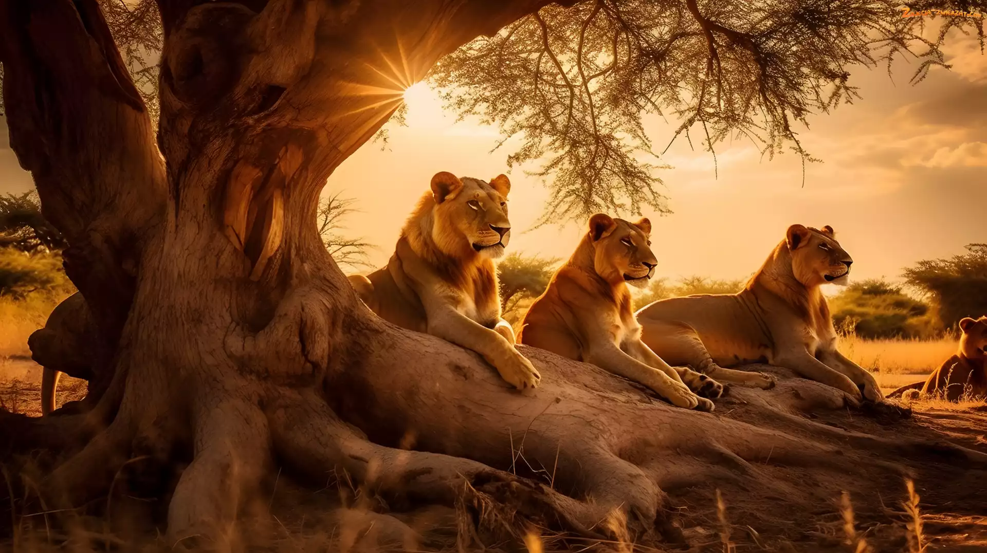 Promienie słońca, Drzewo, Grafika, Trzy, Lwice