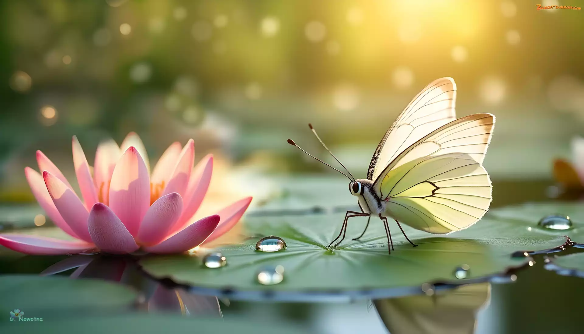 Zdjęcie: Lilia wodna, Różowa, Grafika, Biały, Motyl
