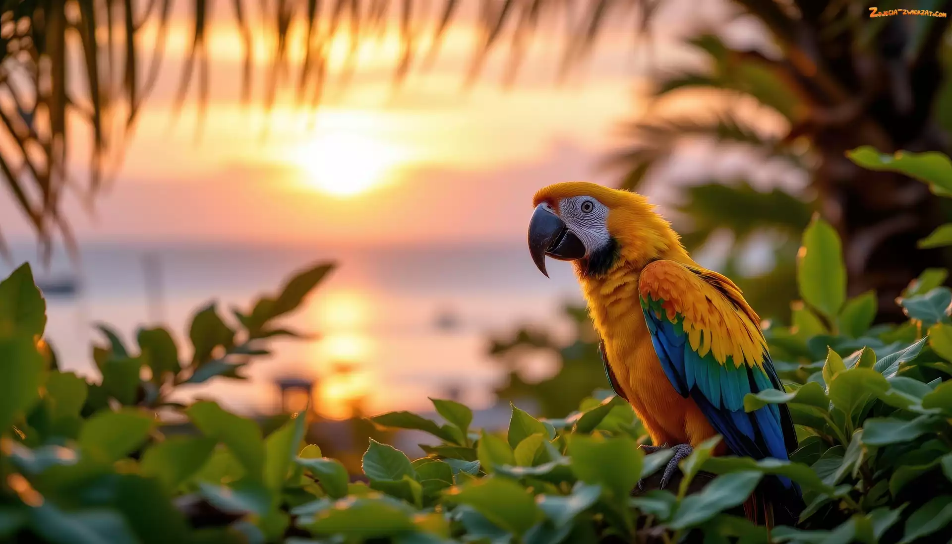 Zdjęcie: Zachód słońca, Liście, Grafika, Ara, Papuga