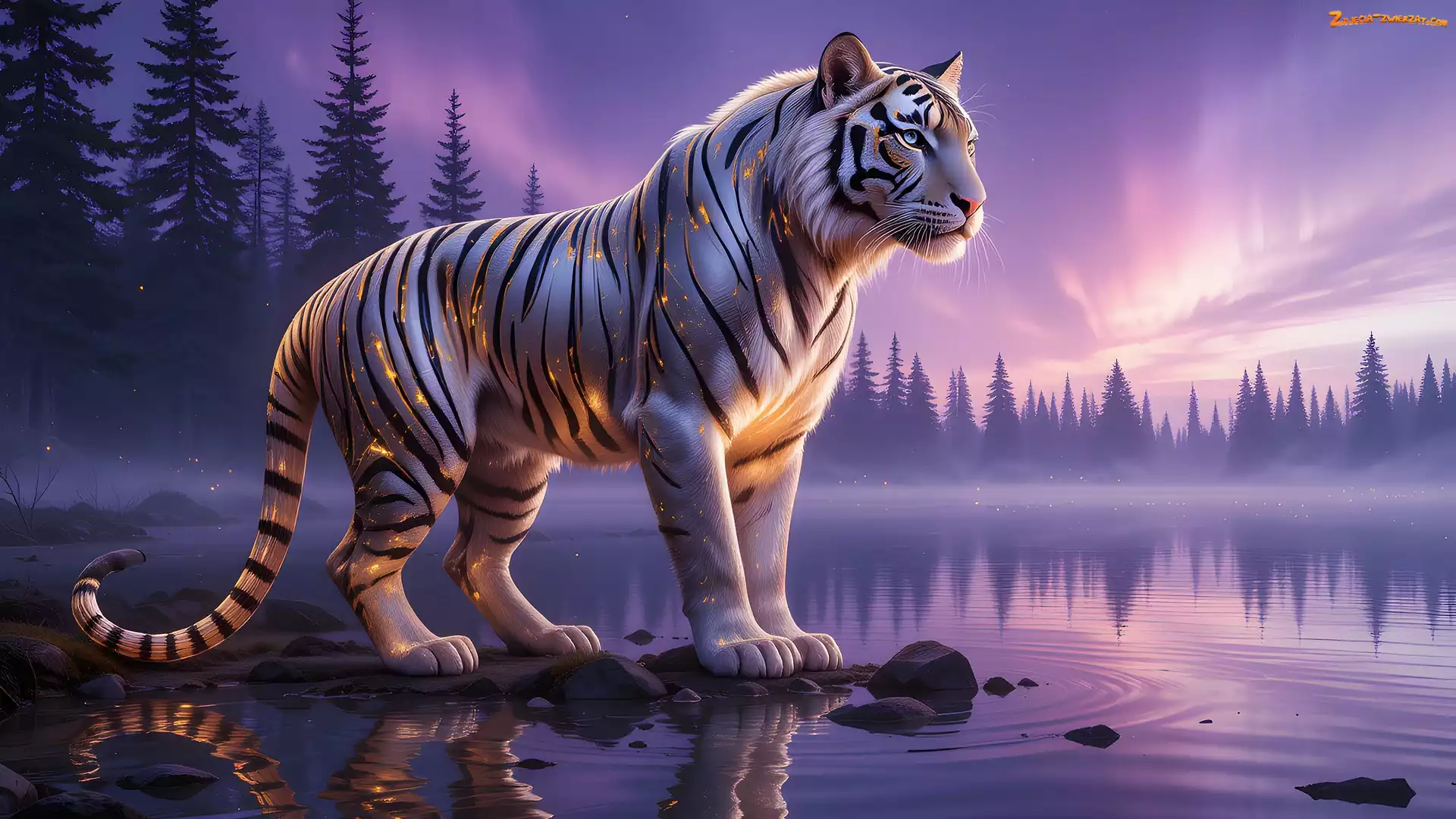 Kamienie, Zorza polarna, Grafika, Tygrys, Jezioro, Drzewa