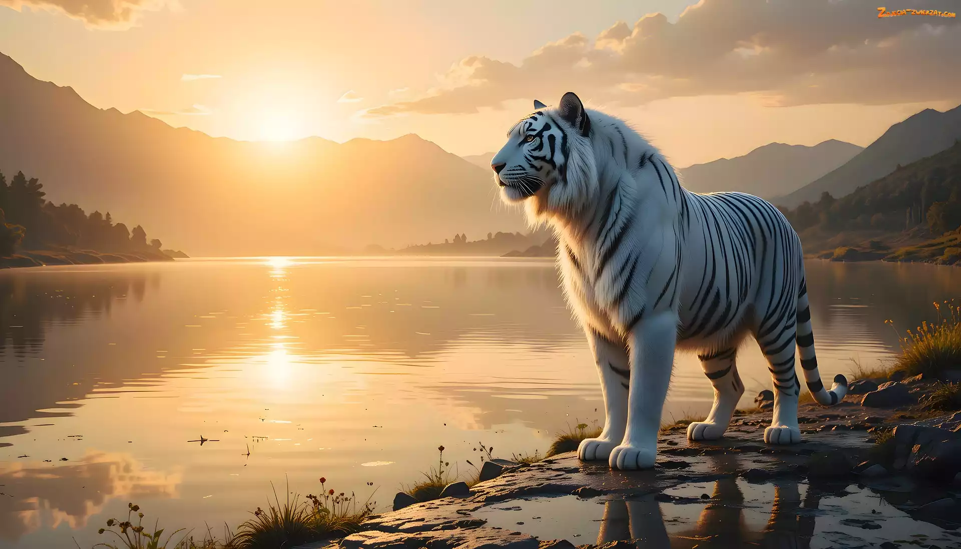 Zachód słońca, Jezioro, Grafika, Biały, Tygrys