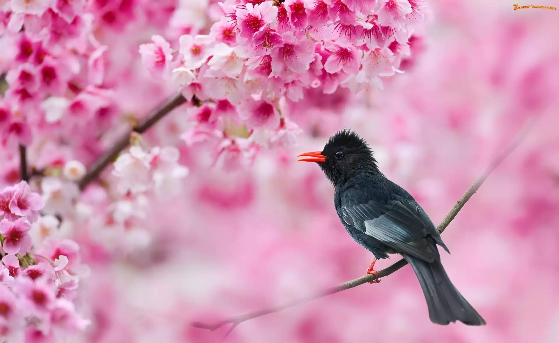 Zdjęcie: Szczeciak granatowy, Czarny, Owocowe, Drzewo, Ptak, Kwiaty