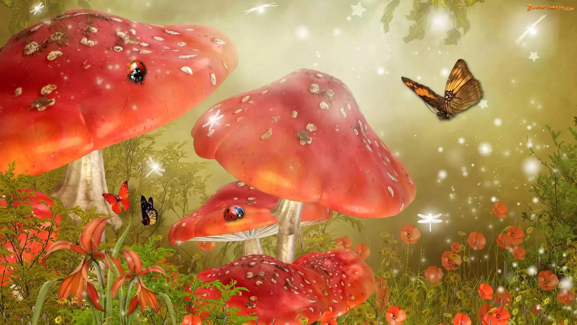Grzyby, Biedronki, Łąka, Motyle