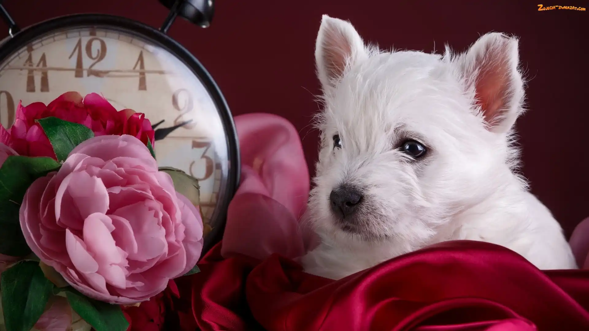 Zdjęcie: West highland white terrier, Kwiaty, Szczeniak, Zegar