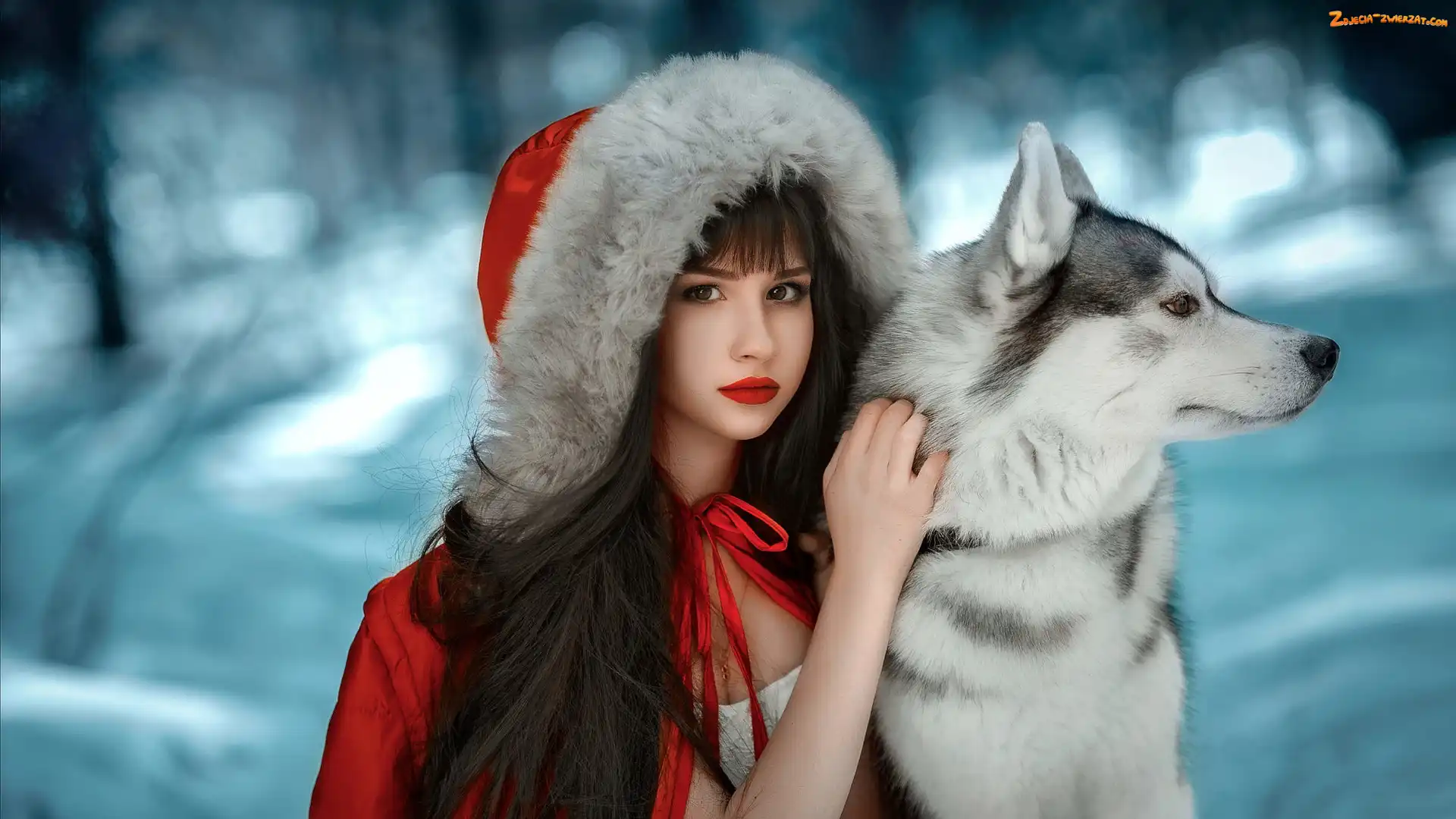 Zdjęcie: Siberian husky, Płaszcz, Dziewczyna, Śnieg, Pies, Czerwony, Kaptur