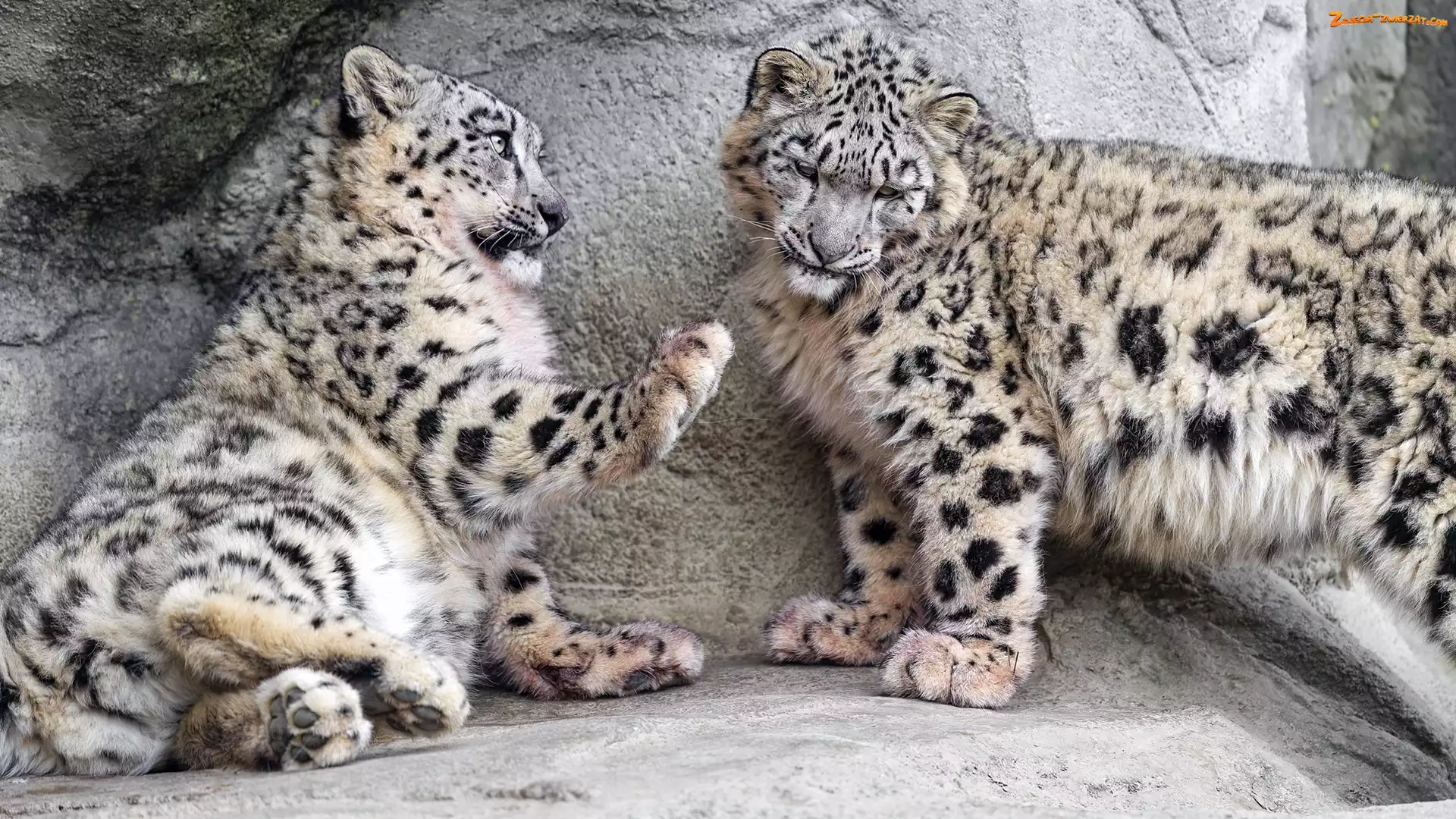 Zdjęcie: Dwa, Irbisy śnieżne, Zabawa, Skały
