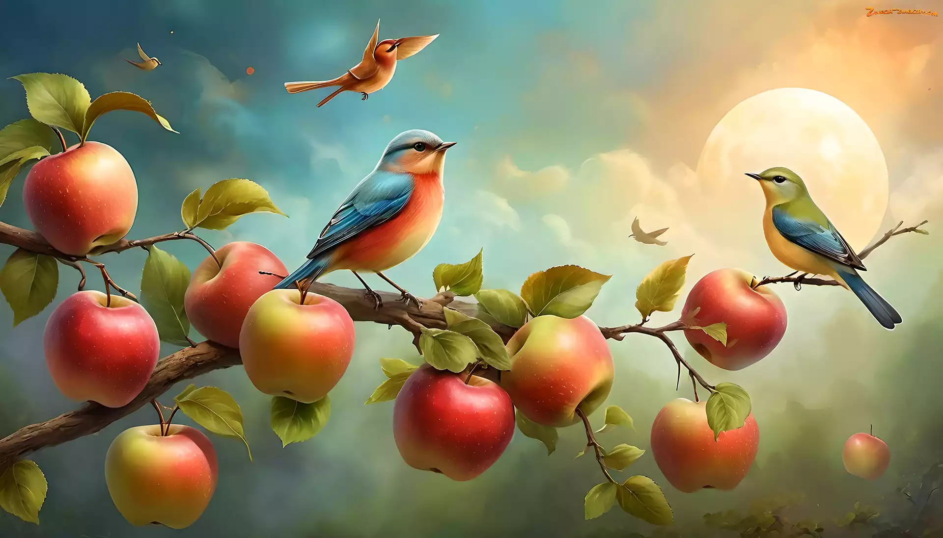 Gałąź, Jabłka, Grafika, Kolorowe, Ptaki