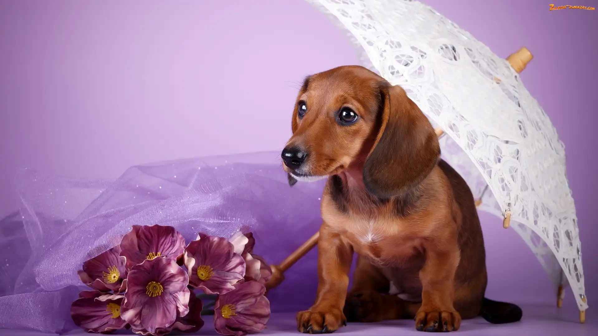 Zdjęcie: Jamnik krótkowłosy, Kwiaty, Pies, Parasolka