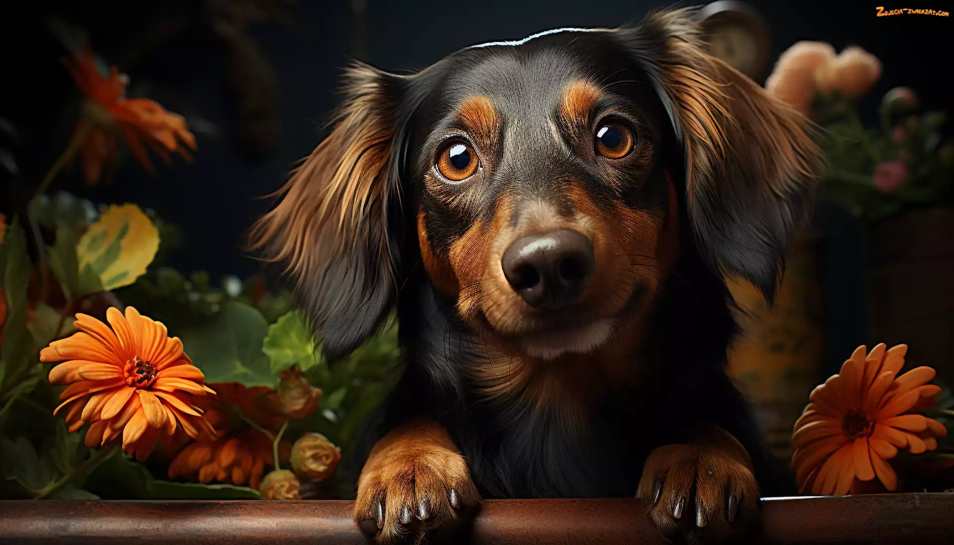 Zdjęcie: Pies, Szczeniak, Kwiaty, Jamnik