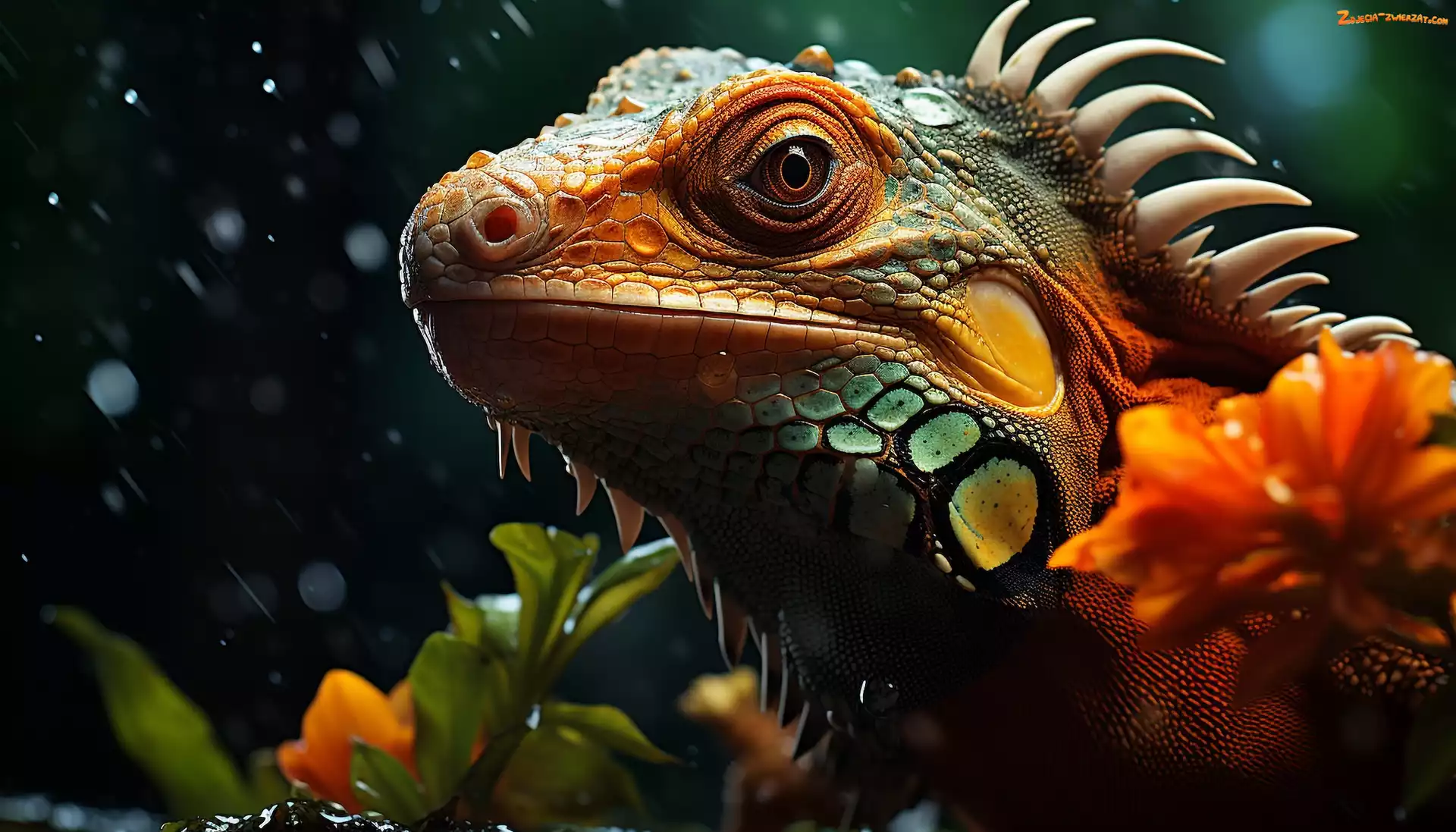 Zdjęcie: Kwiaty, Zbliżenie, Głowa, Jaszczurka, Legwan zielony