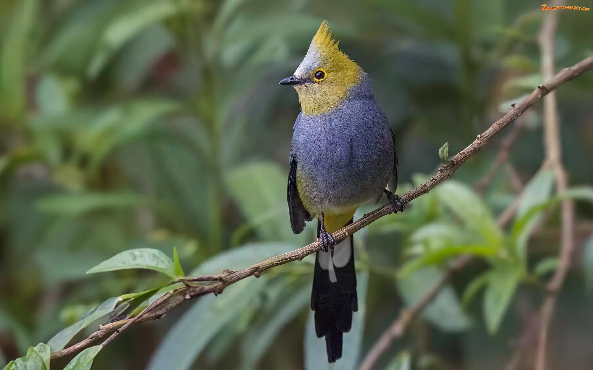 Zdjęcie: Ptak, Jedwabniczka długosterna, Liście, Gałązka