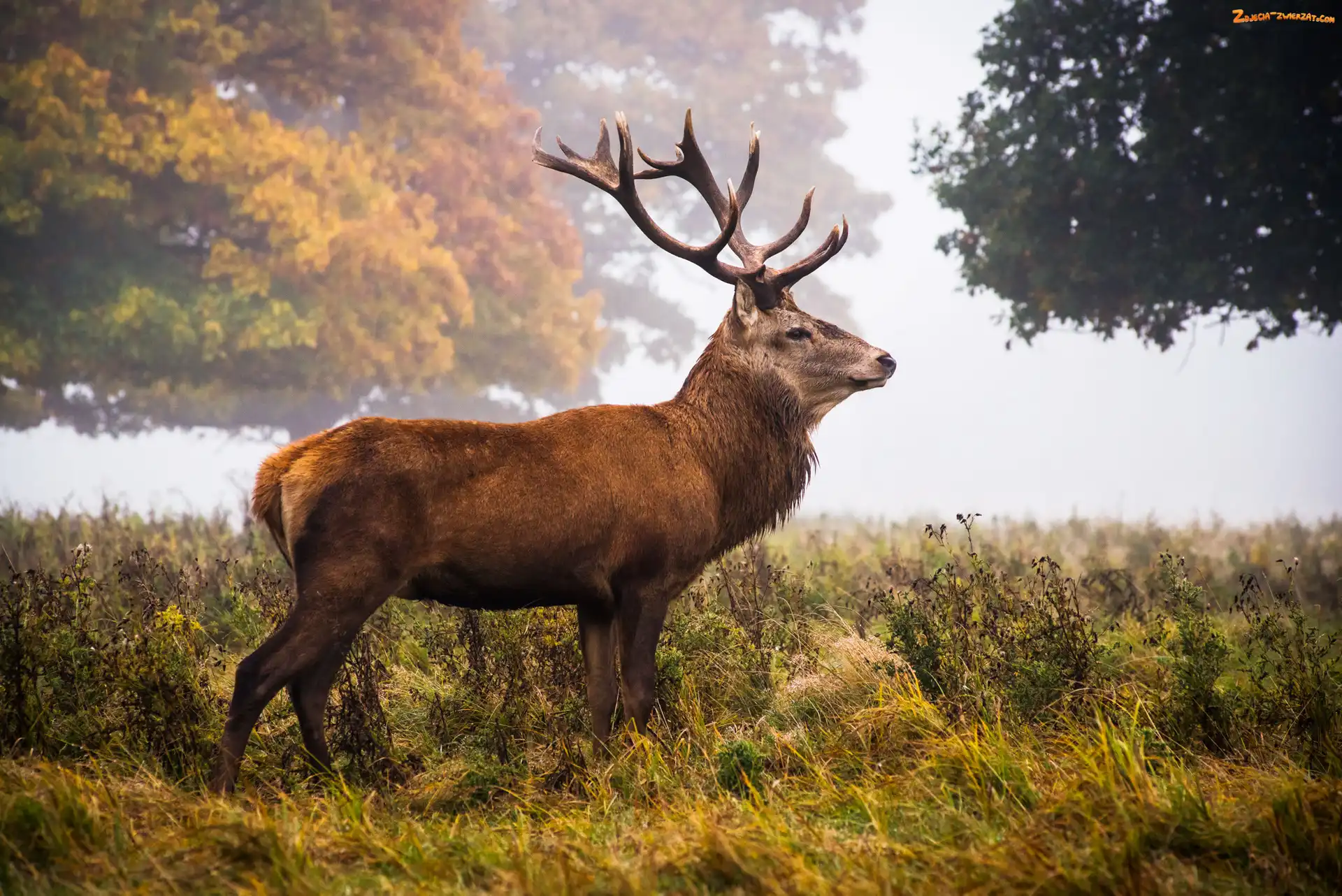 Łąka, Mgła, Jeleń, Drzewa