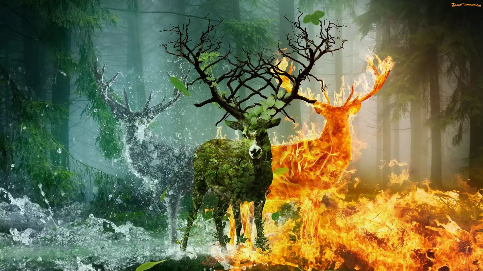 Zdjęcie: Jelenie, Grafika, Las, Woda, Fantasy, Ogień