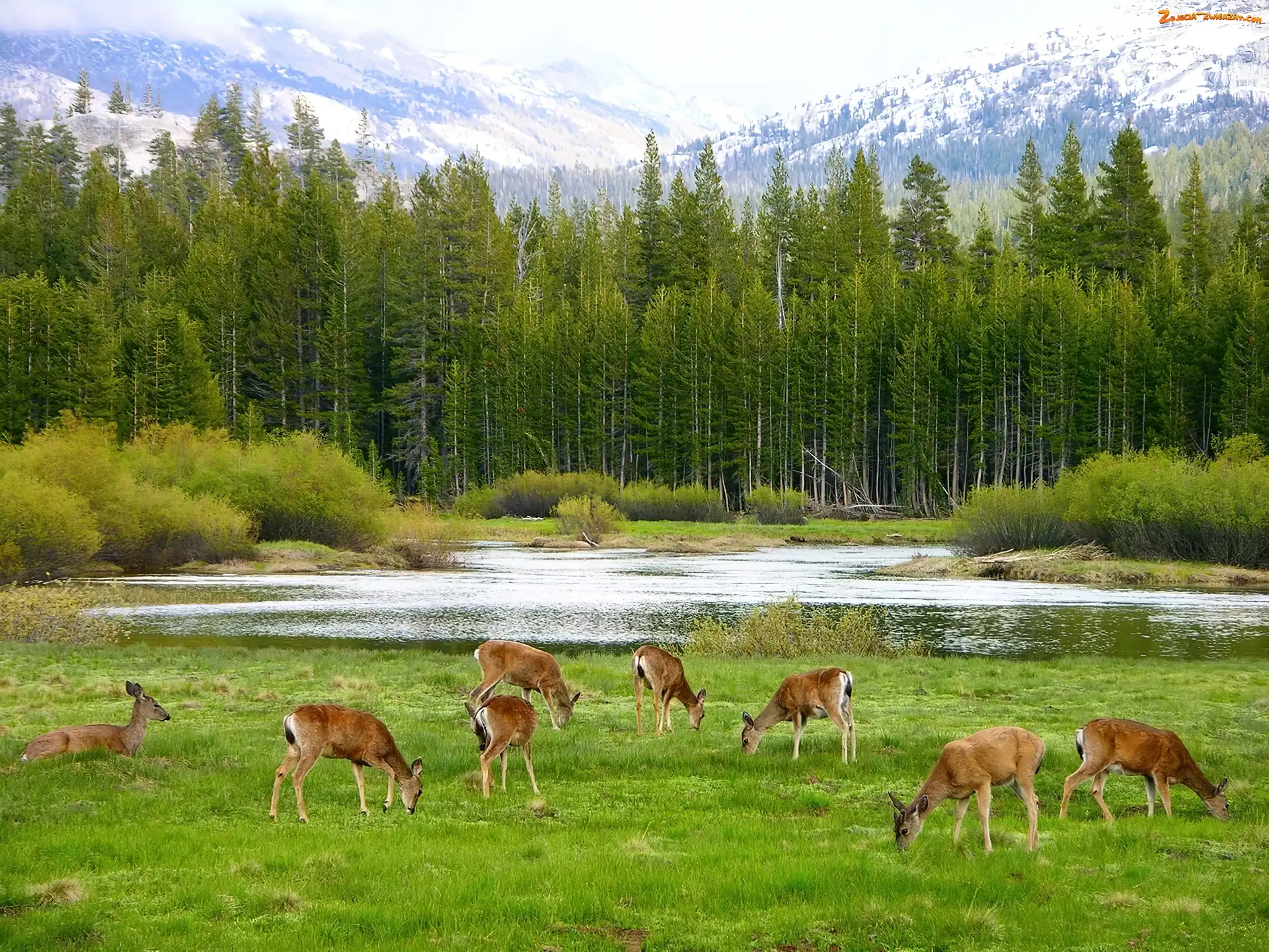 Zdjęcie: Łąka, Las, Jelenie, Rzeka