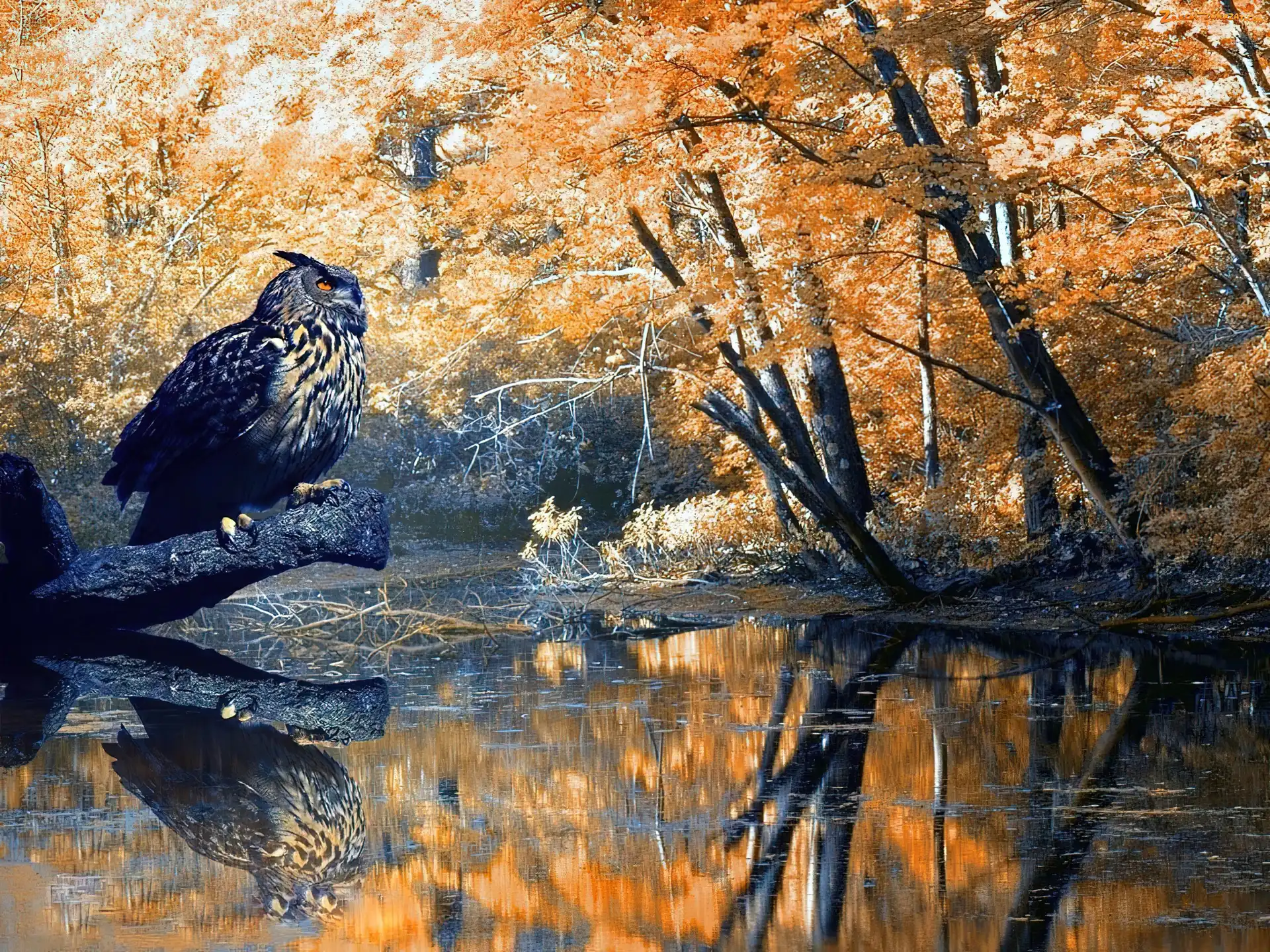 Zdjęcie: Jesień, Drzewa, Sowa, Woda