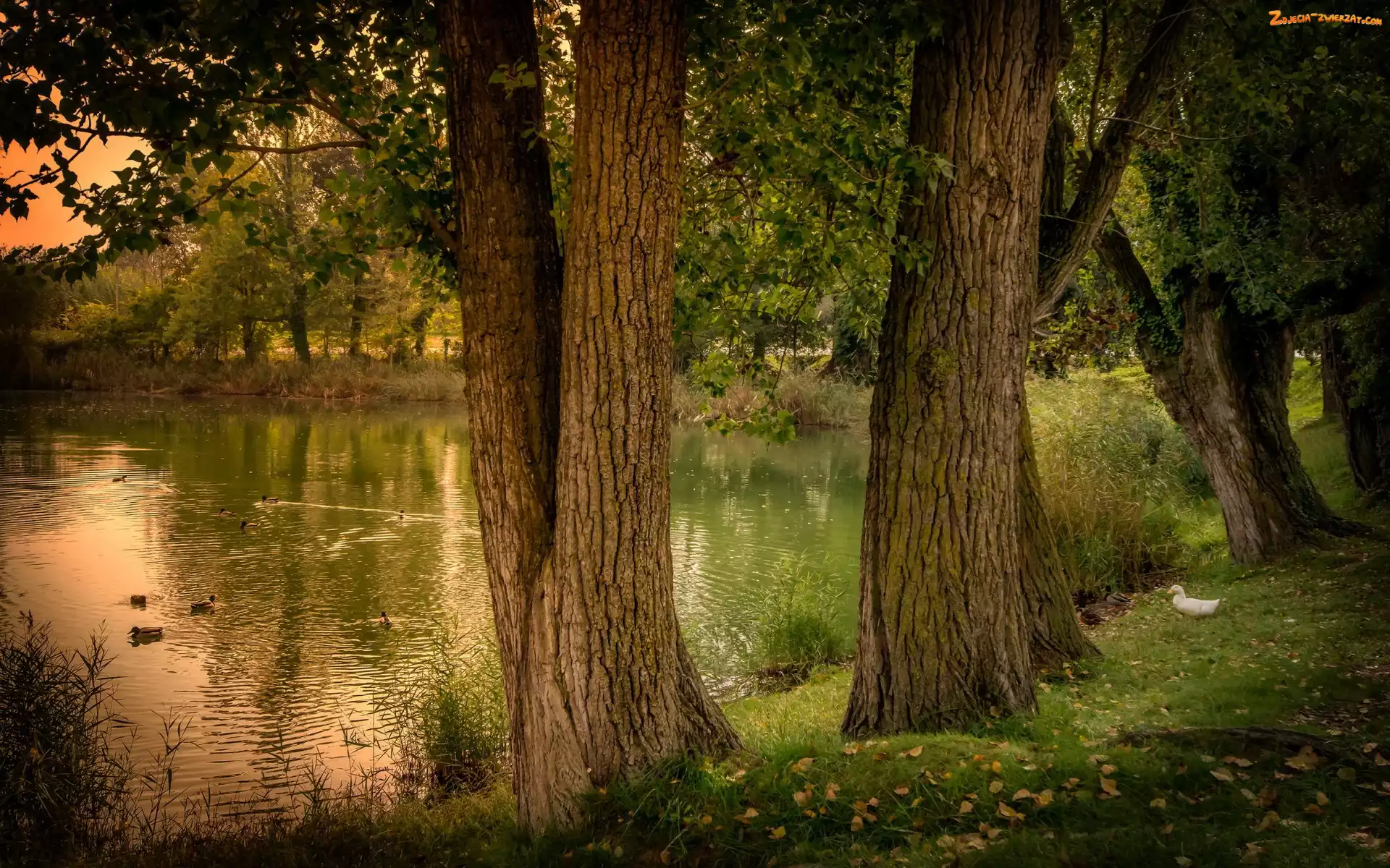 Jesień, Liście, Kaczki, Staw, Drzewa