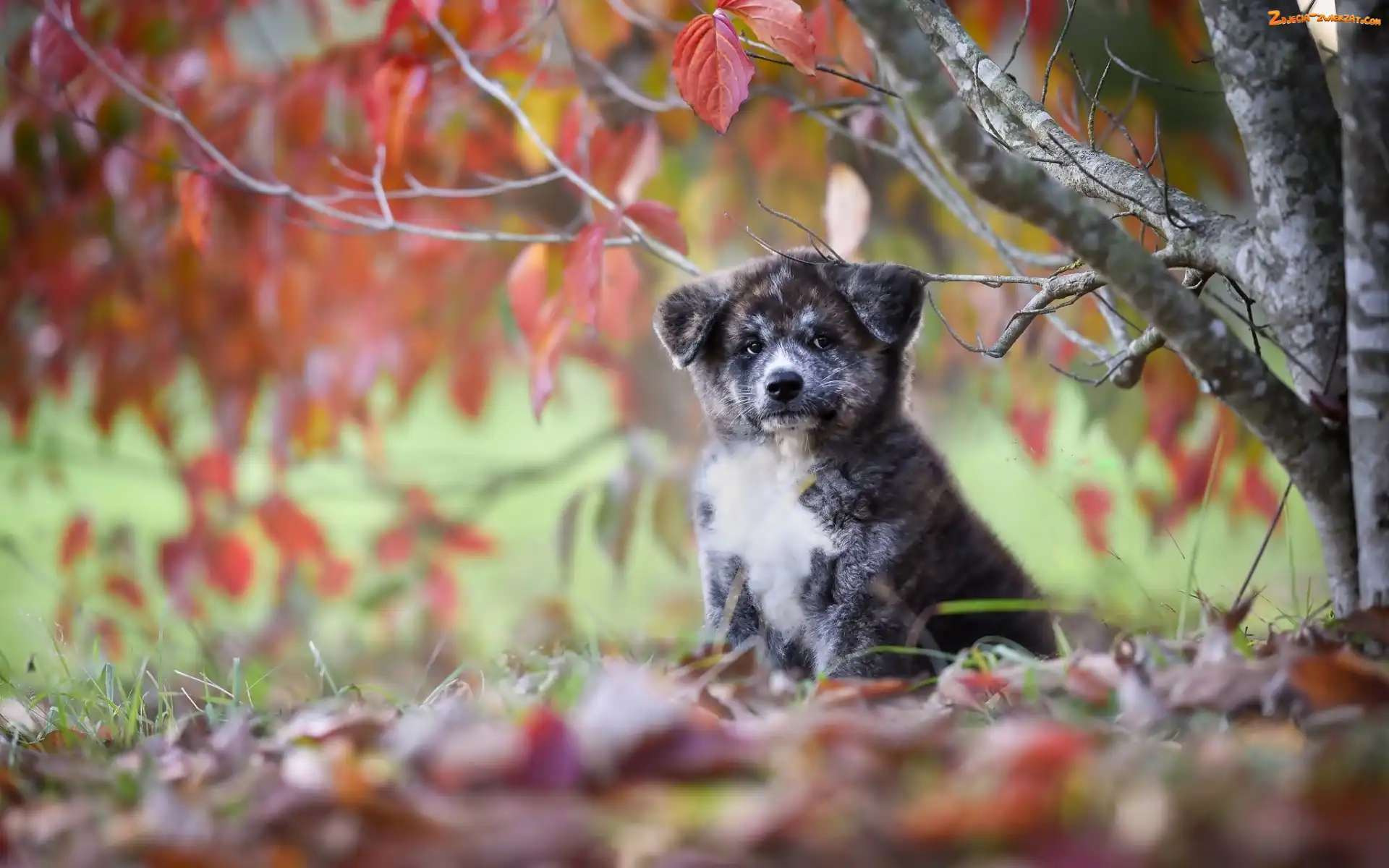 Zdjęcie: Jesień, Liście, Akita inu, Szczeniaczek, Drzewo