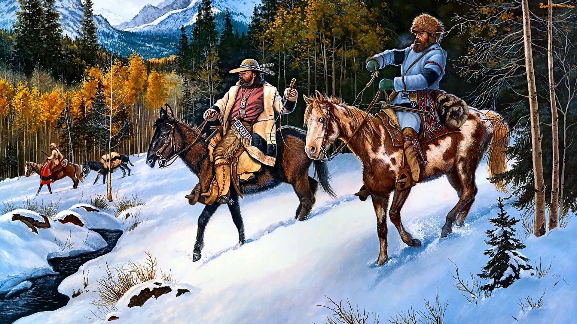 Zdjęcie: Jerry Crandall, Mężczyźni, Zima, Malarstwo, Konie, Góry, Las, Jeźdźcy