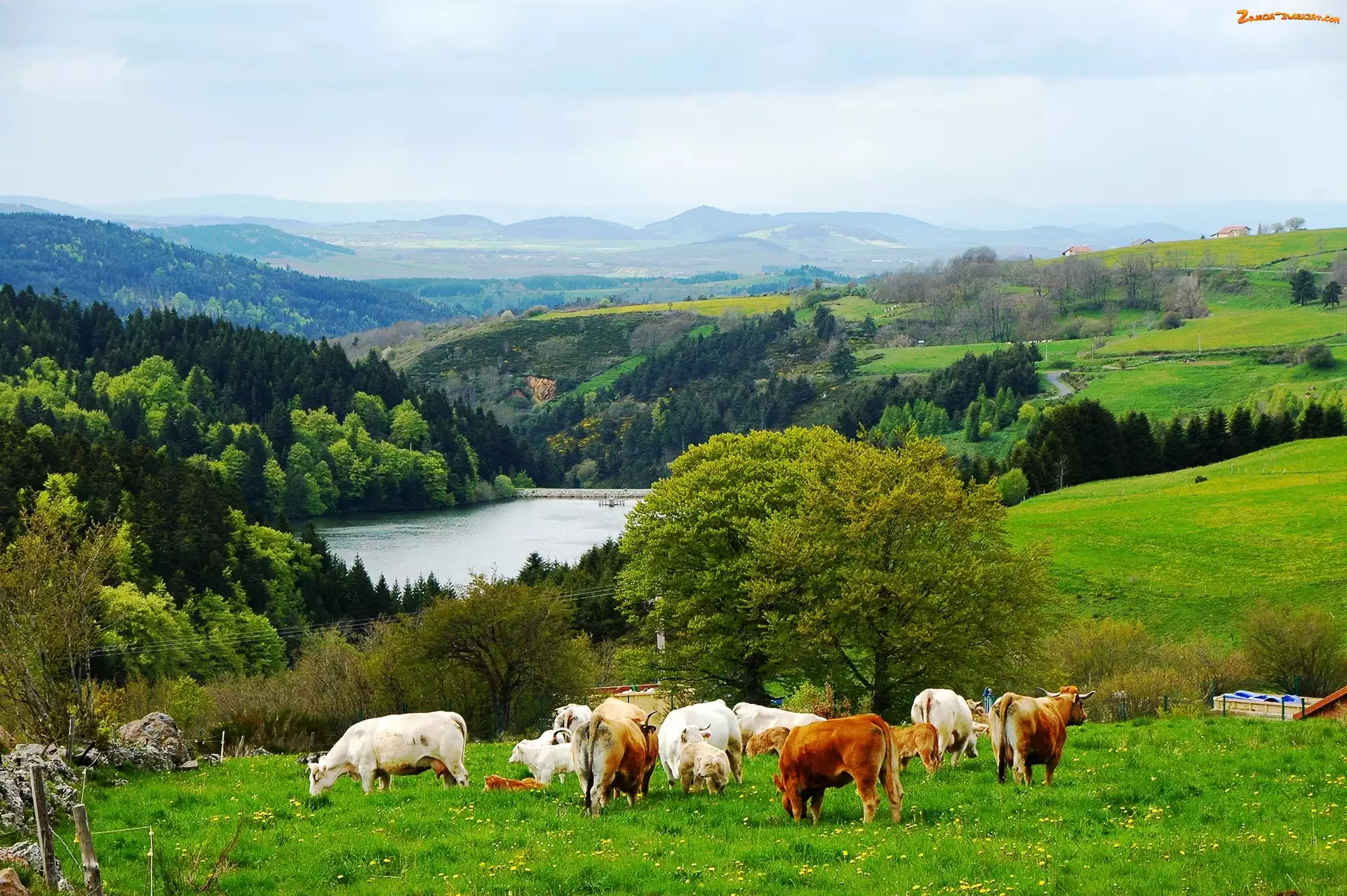 Zdjęcie: Jezioro, Łąki, Góry, Krowy, Lasy