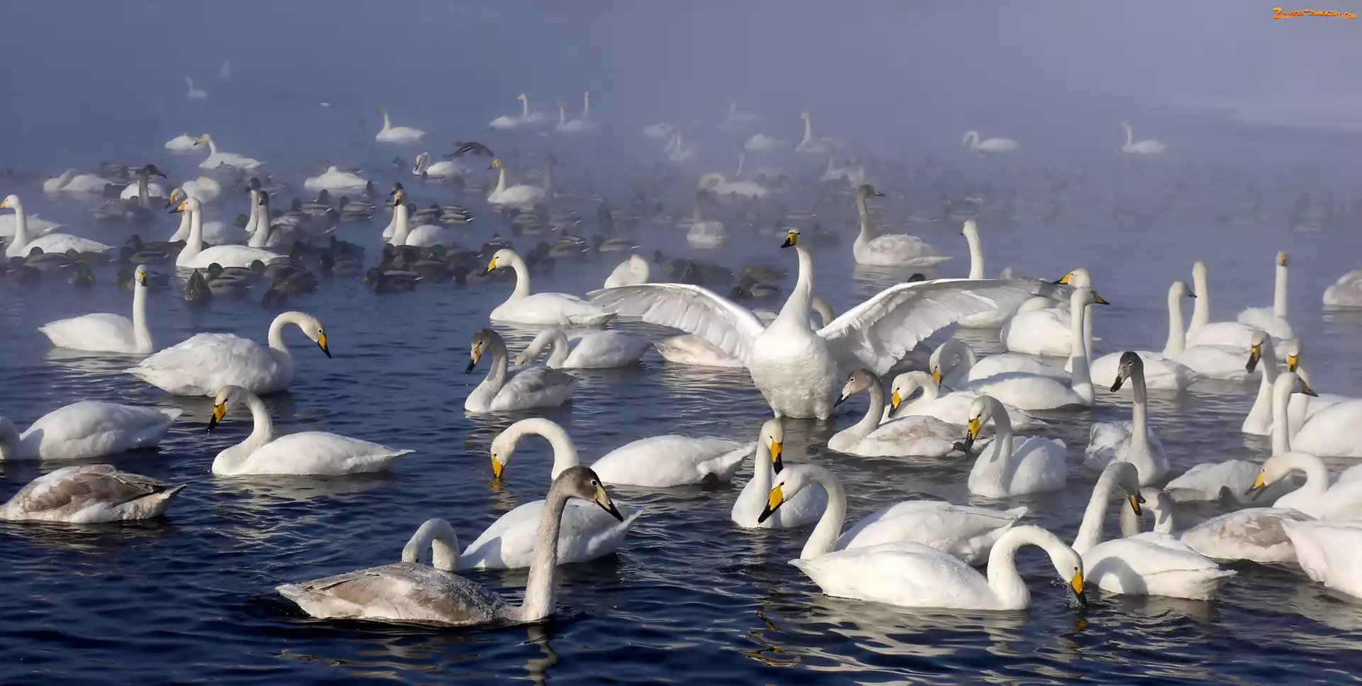 Łabędzie, Mgła, Jezioro, Kaczki